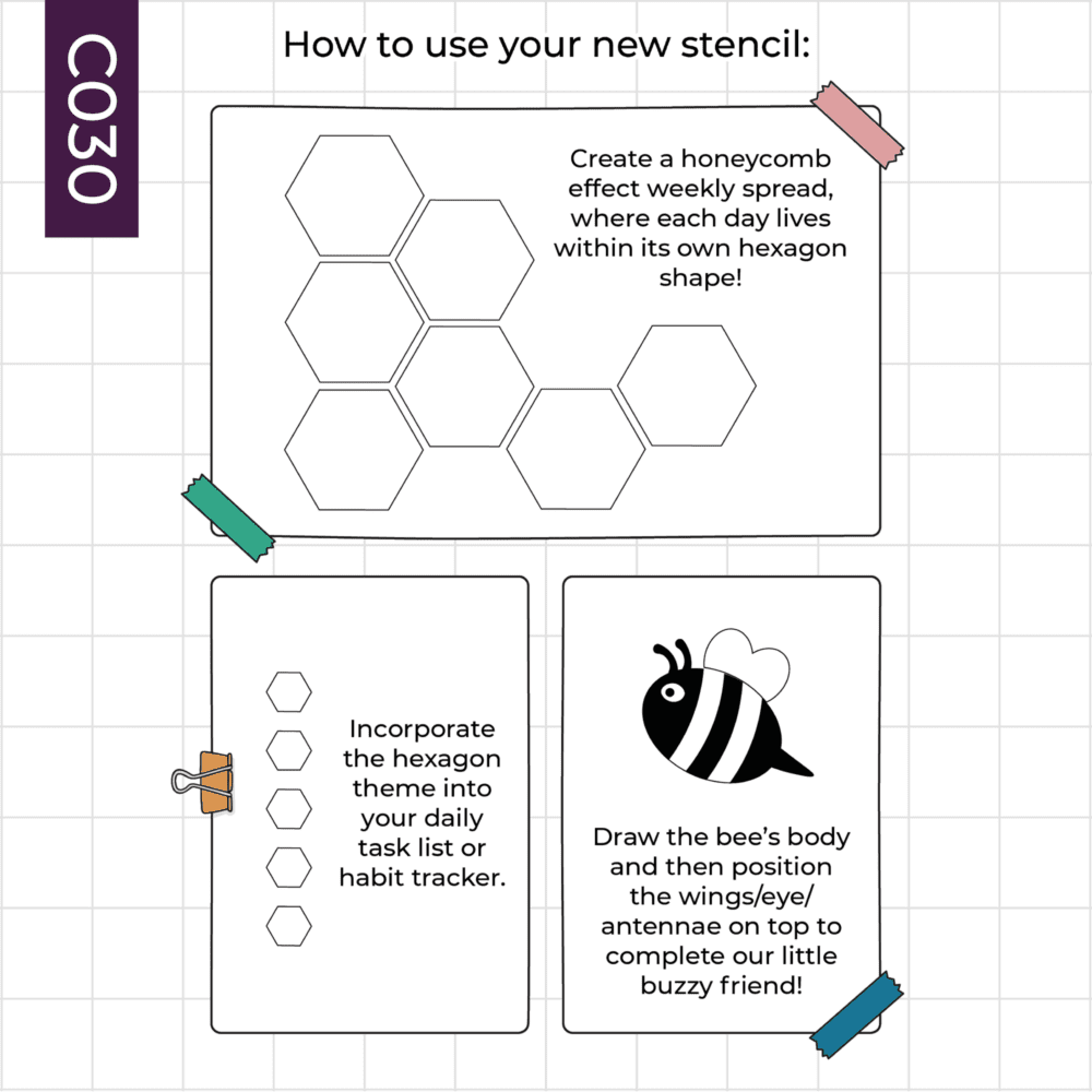 The Hexagon classic stencil has a range of different sized hexagons, group together for a fun weekly spread, throw in some florals and bees for a full on honeycomb effect.