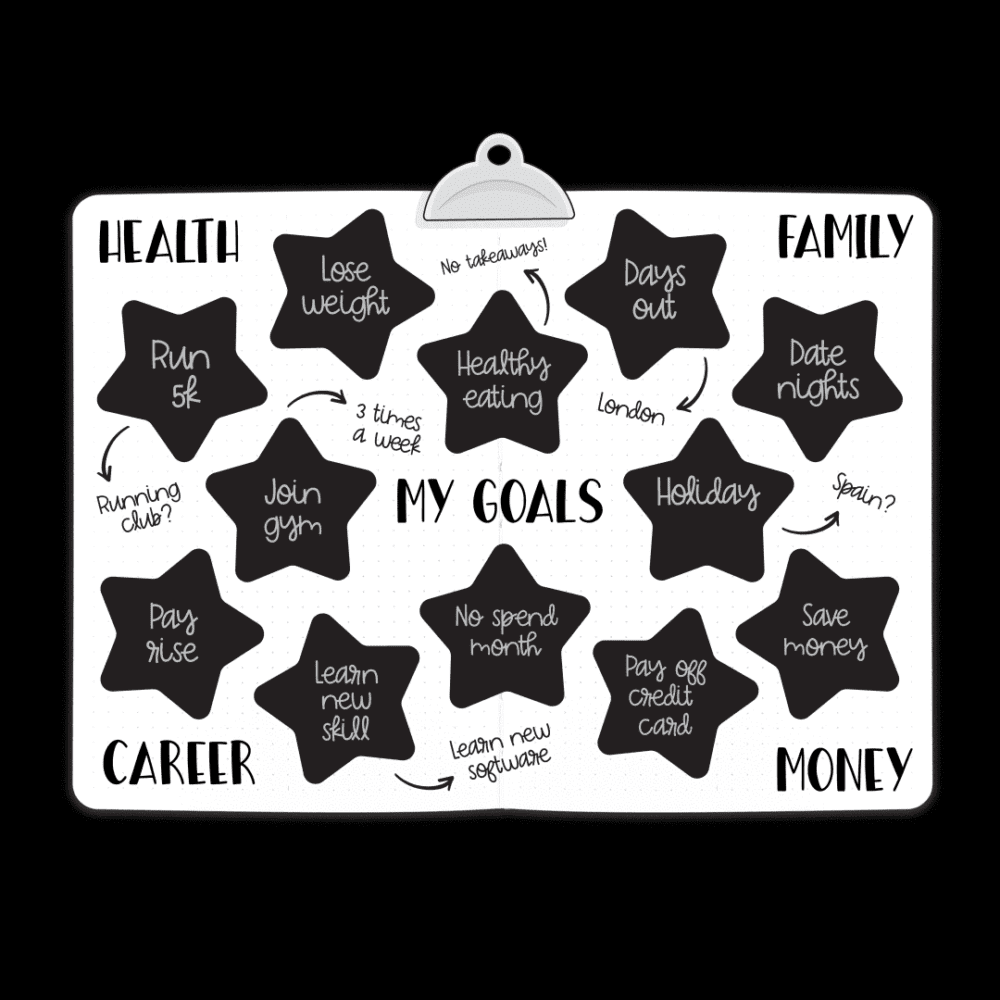 You can break your goals down into different topics or, if you have a clear idea of the kind of thing you’d like to achieve next year, then feel free to make your spread all about one topic.