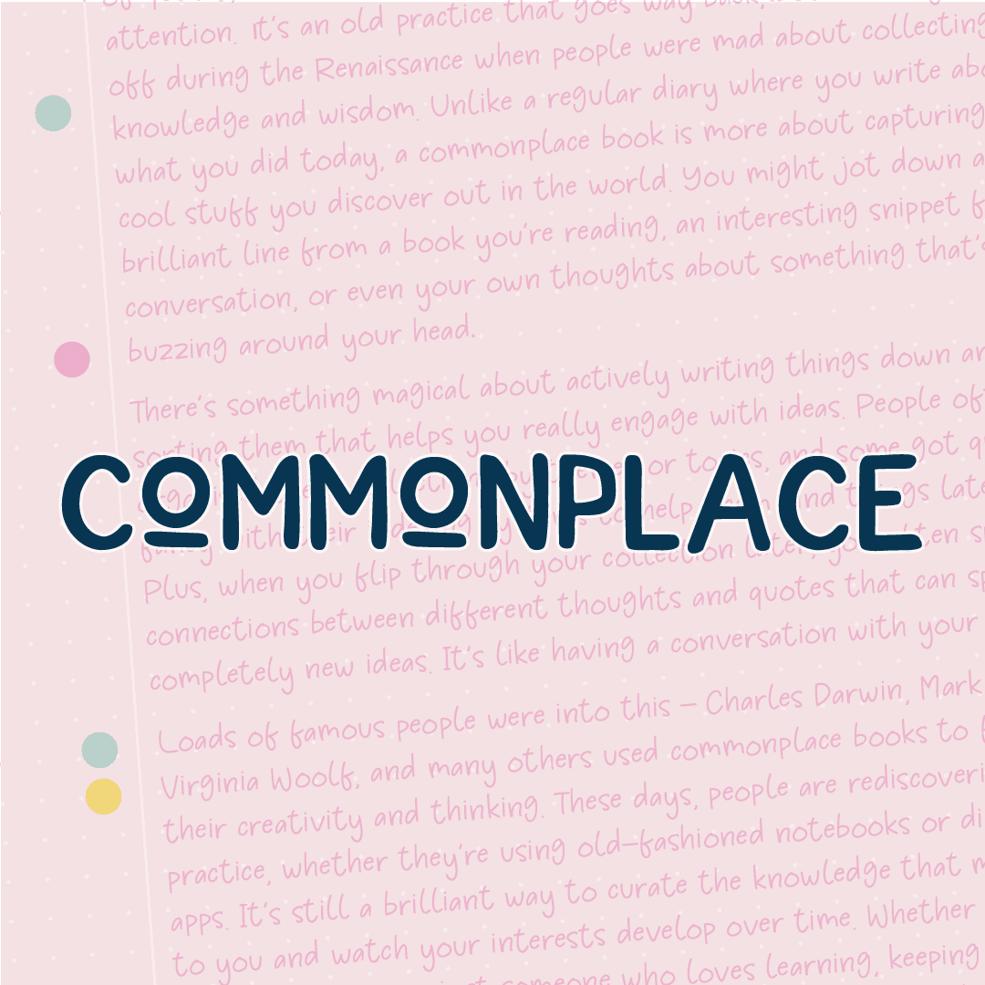 Think of a commonplacing as your personal treasure chest of cool stuff – quotes, random thoughts, brilliant ideas, and anything else that makes you go “ooh, I want to remember this!” It’s not a diary about your day, but more like creating your own mini library of awesomeness that you can flip through whenever you need a spark of inspiration. The best part? It’s totally yours, so you can collect whatever floats your boat – whether that’s deep philosophical quotes, quirky facts, recipes, or snippets from your favourite books.