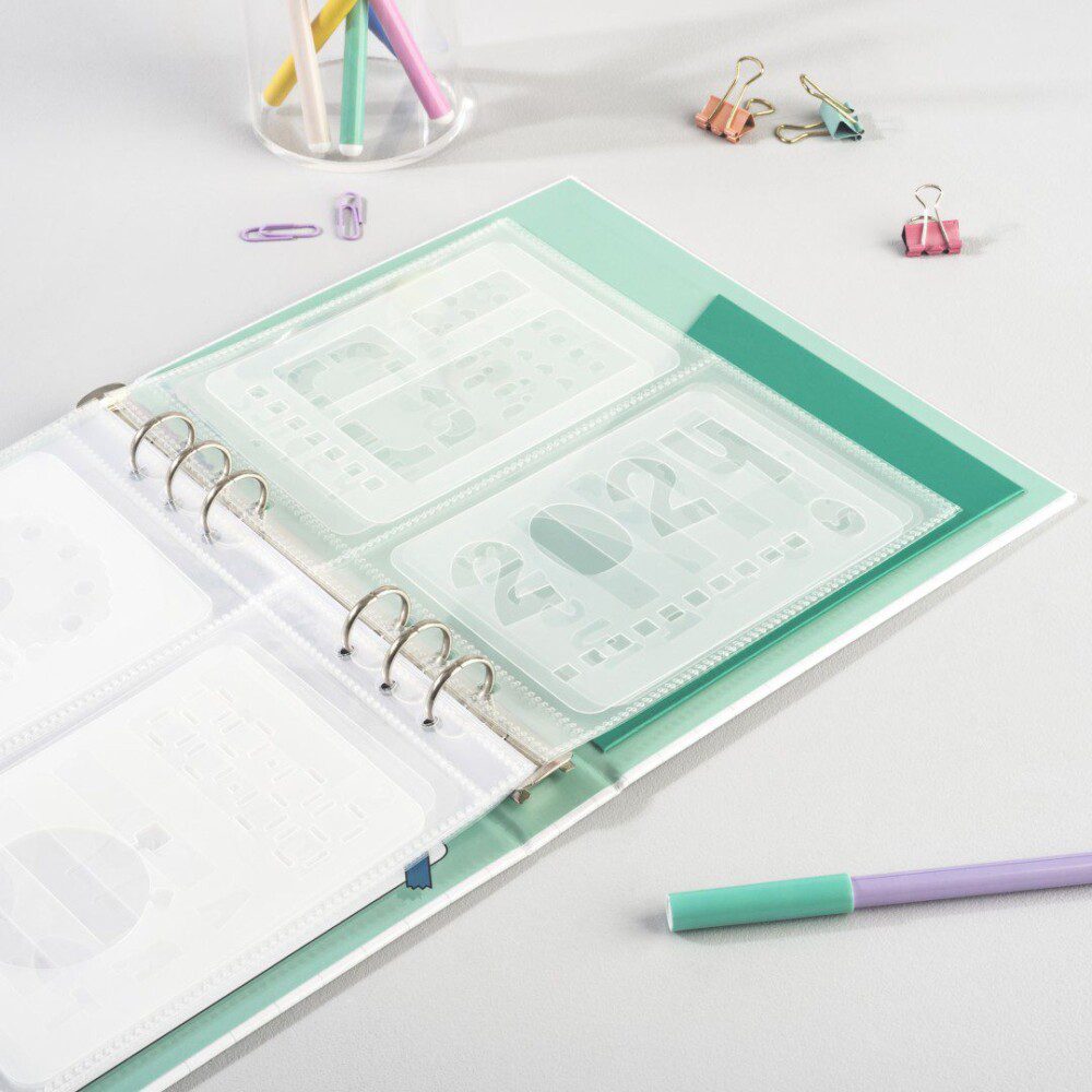 Hole punched stencils and Cheat Sheets can be stored directly in the binder.