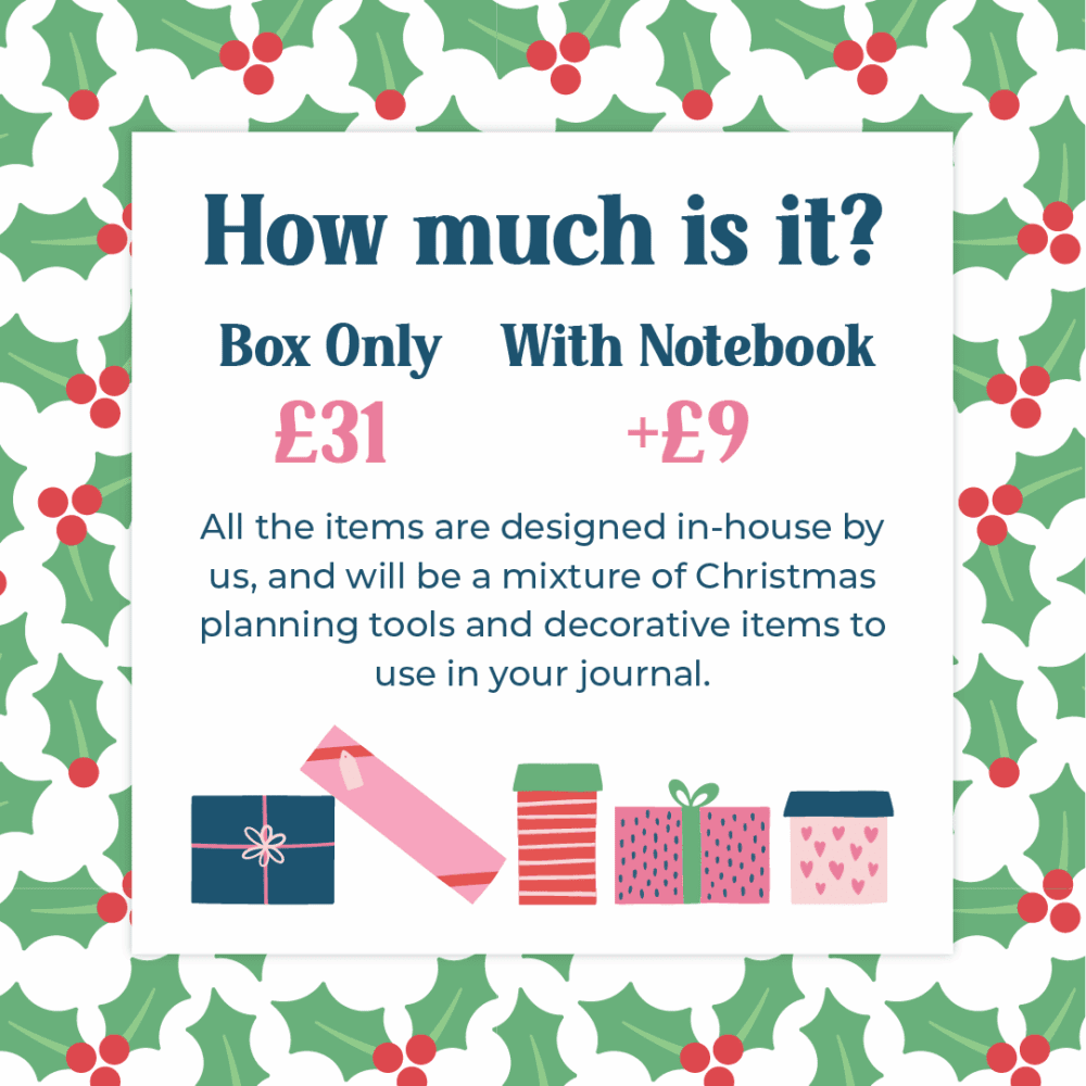 This year we are returning to our original format of having a surprise box filled with festive goodies! Everything is designed in-house by us, and the items will be a mixture of Christmas planning tools and decorative items to use in your journal.