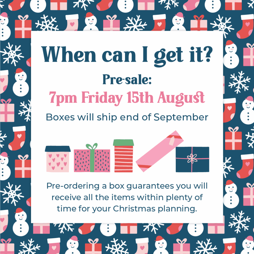 We are planning to ship the boxes at the end of September, leaving plenty of time for you to use your goodies to plan your Christmas period!