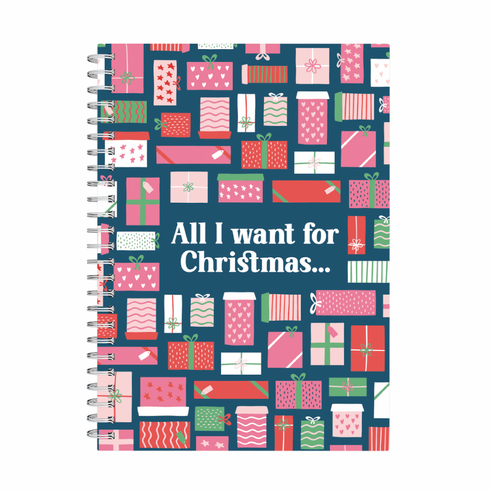 “All I want for Christmas…” features super cute gift boxes with adorned with adorable bows, in a fresh festive colour palette of pinks, red, blue, and green.