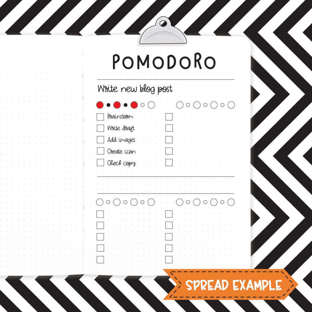 It can be really useful to add a pomodoro tracker to your journal for any project you are currently working on. This allows you to keep track of how much time the particular task takes (helpful info for when you need to repeat the task in the future).