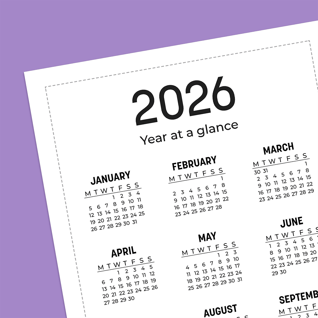 This Monday start 2026 Year-at-a-Glance full-page journal sticker gives you a clean, ready-to-use snapshot of the entire year on a single planner or journal page. Each month is neatly laid out with weekdays labelled from Monday to Sunday, making it easy to reference dates, plan ahead, or map out bigger projects without flipping through multiple pages. It’s a simple but powerful overview that keeps the whole year visible at a glance.