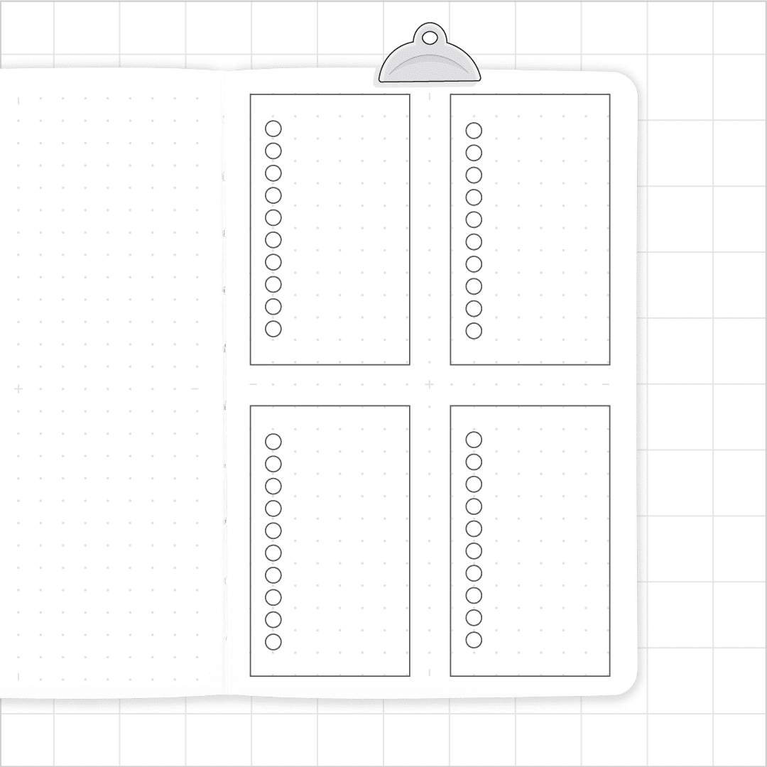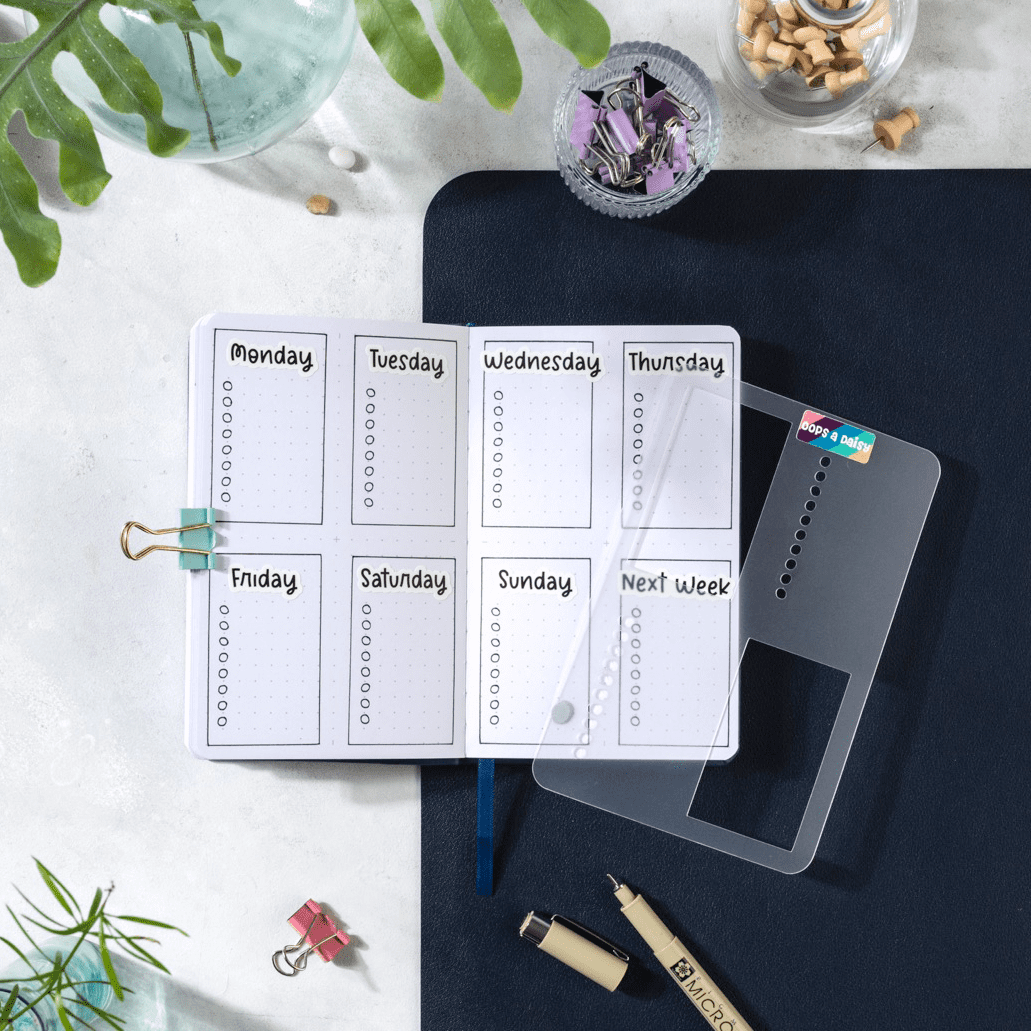 This journal stencil helps you quickly create a versatile spread with four boxes on a page – Simply trace onto your page, then flip the stencil and trace again. The spread can then be personalised however you like!
