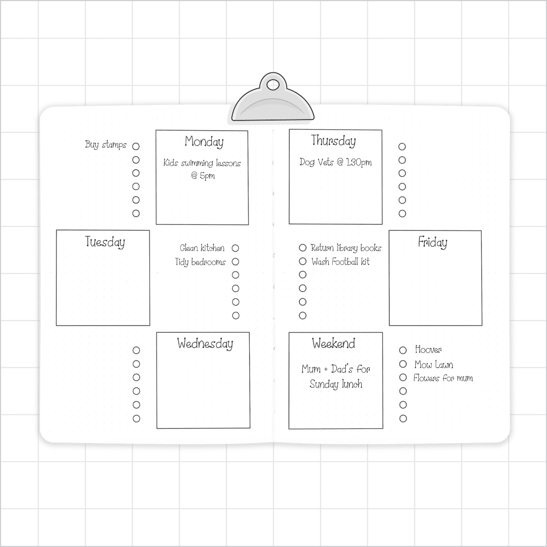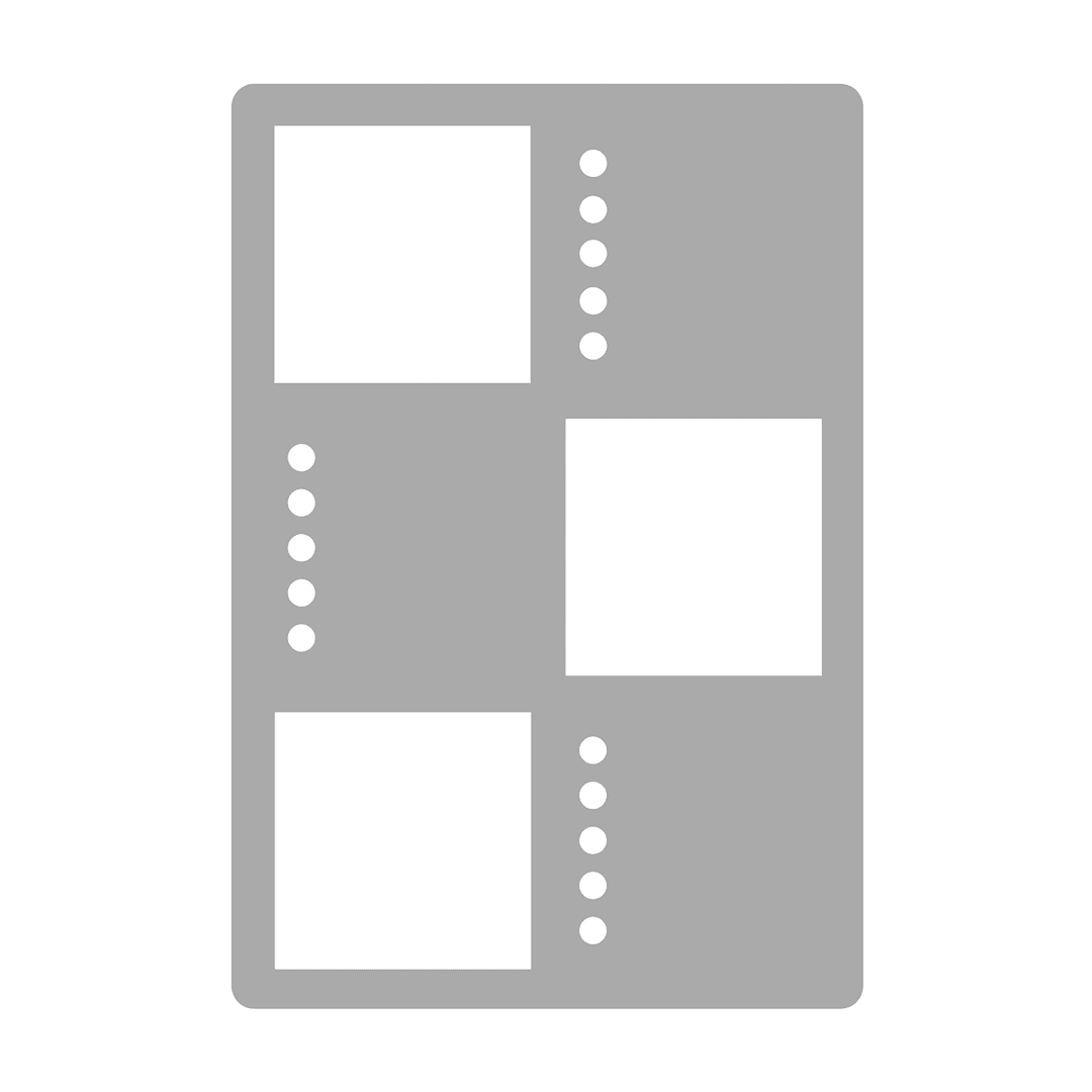 This journal stencil helps you quickly create a versatile spread with six boxes on a page. Simply trace onto your page, then move the stencil down one box and trace in the missing boxes. The spread can then be personalised however you like.