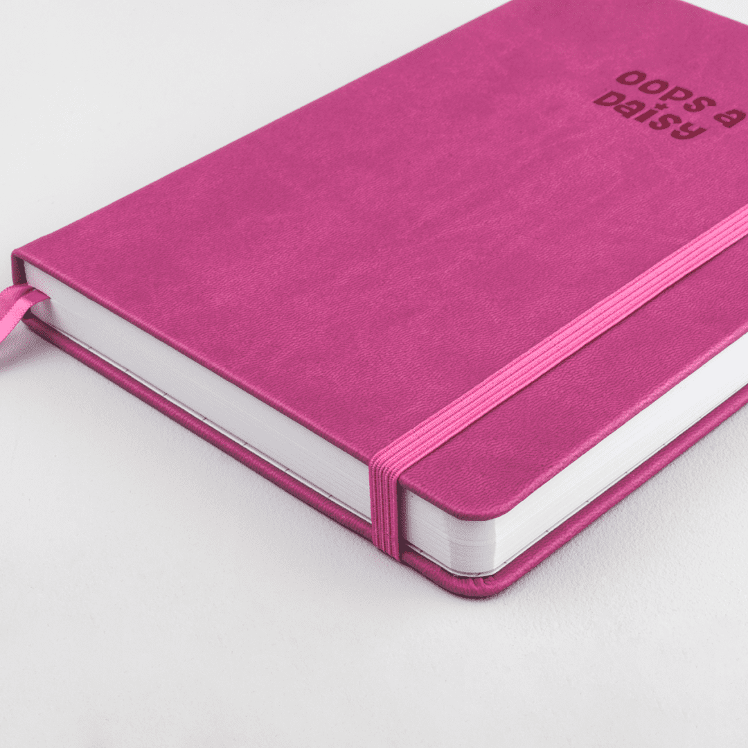 This A5 dotted journal features a gorgeous cherry blossom pink faux-leather cover, de-bossed with the Oops a Daisy logo.