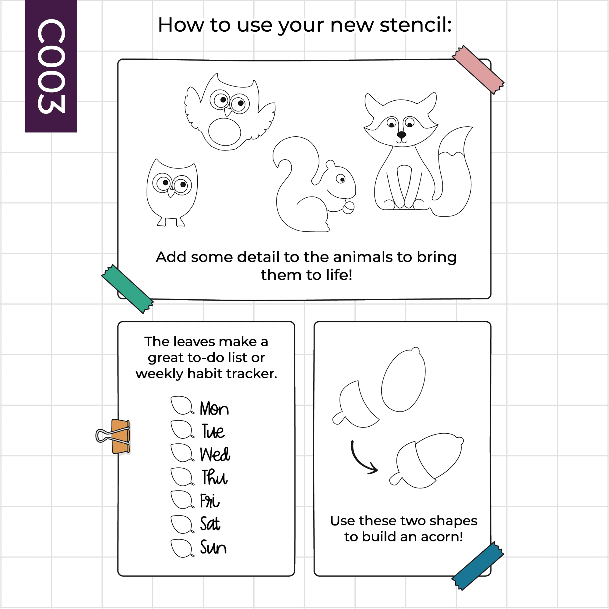This journal stencil features a variety of leaves, acorns and autumnal animals to help you decorate your bullet journal pages - No artistic talent required!