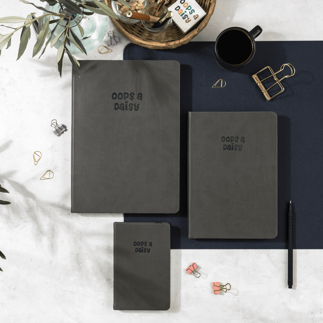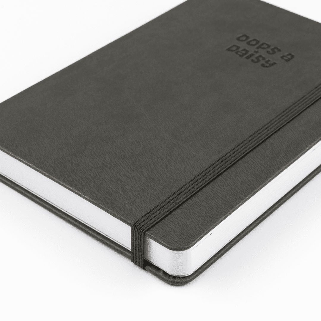 This B5 dotted journal features a gorgeous charcoal grey faux-leather cover, de-bossed with the Oops a Daisy logo.