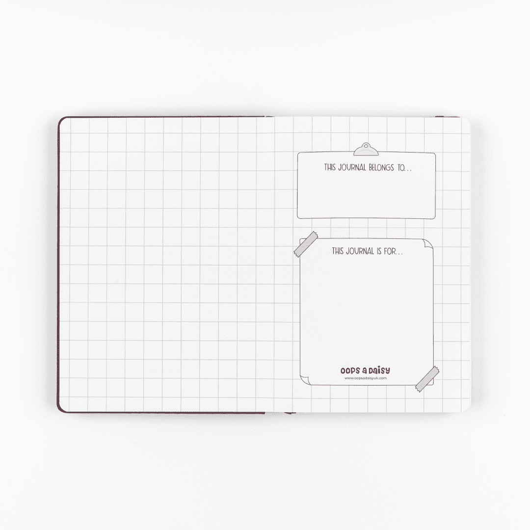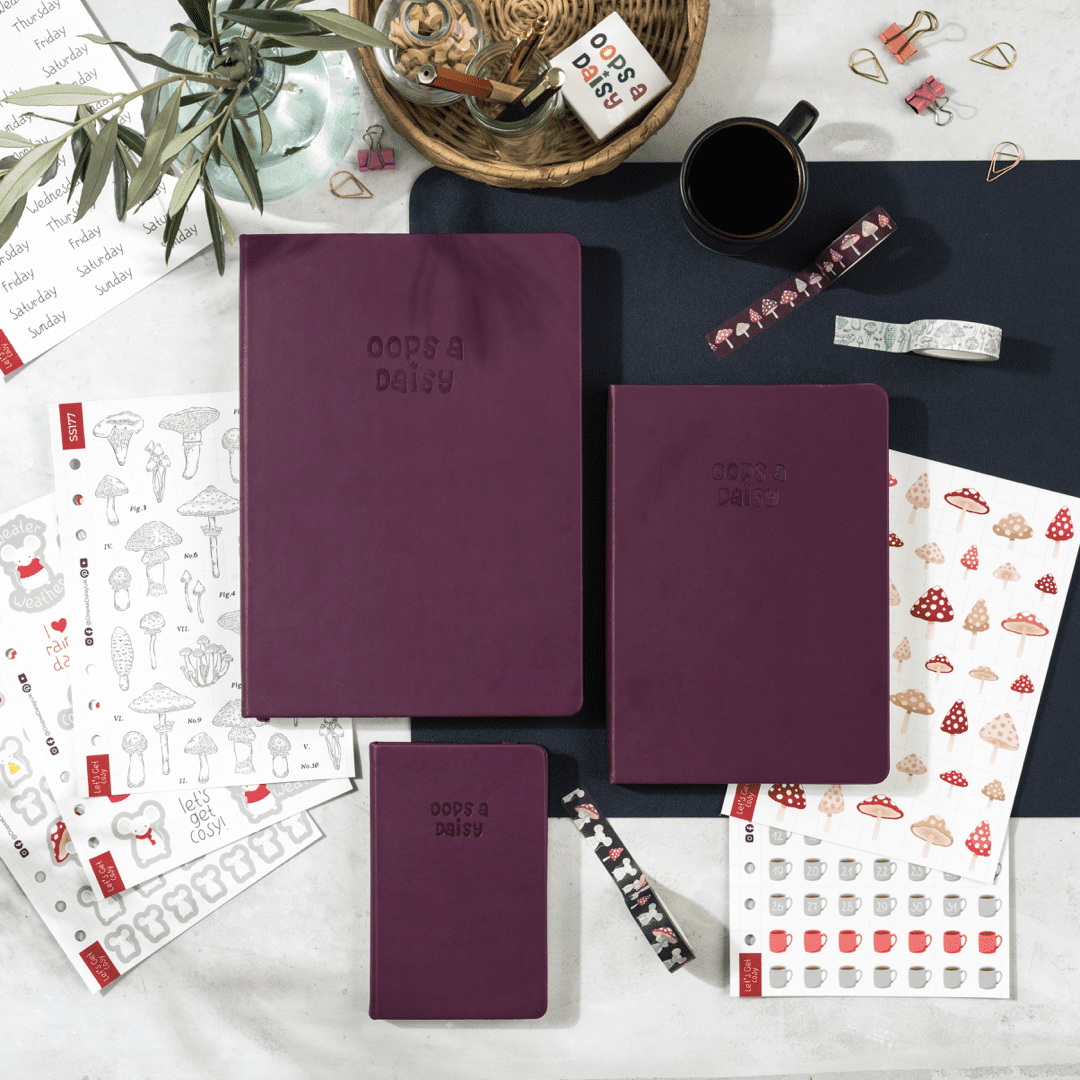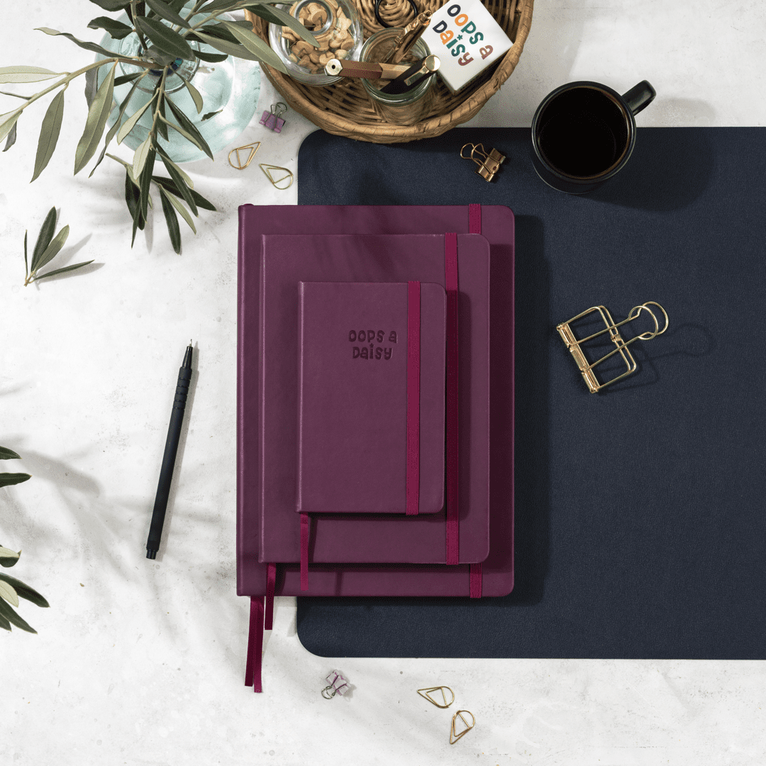 This B5 dotted journal features a gorgeous plum red faux-leather cover, de-bossed with the Oops a Daisy logo.