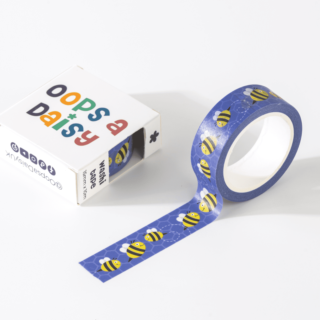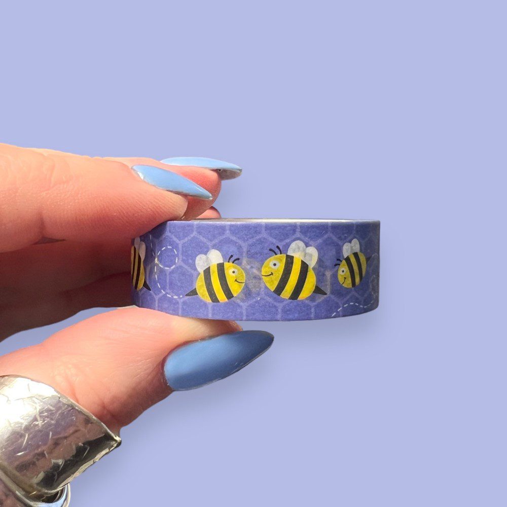 Buzz a little joy into your journal or planner with this adorable Bee Washi Tape. Featuring smiling bumblebees flying across a deep blue background with subtle honeycomb details, this design is perfect for nature lovers and cheerful, feel-good spreads.