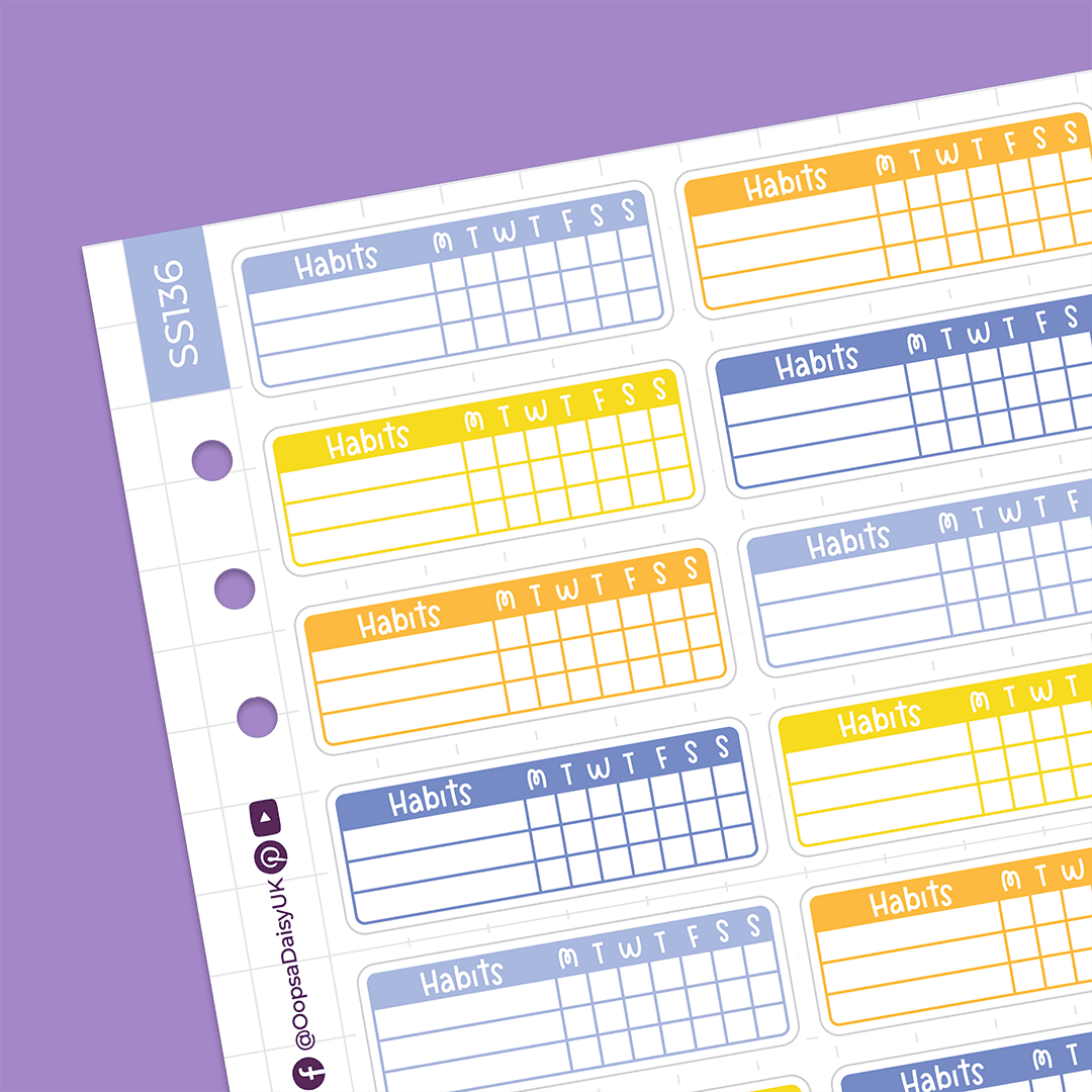 Make tracking your weekly habits in your journal super easy with these habit tracker stickers. The sheet includes 16 writable stickers in a summery colour palette of yellow, orange and purple.