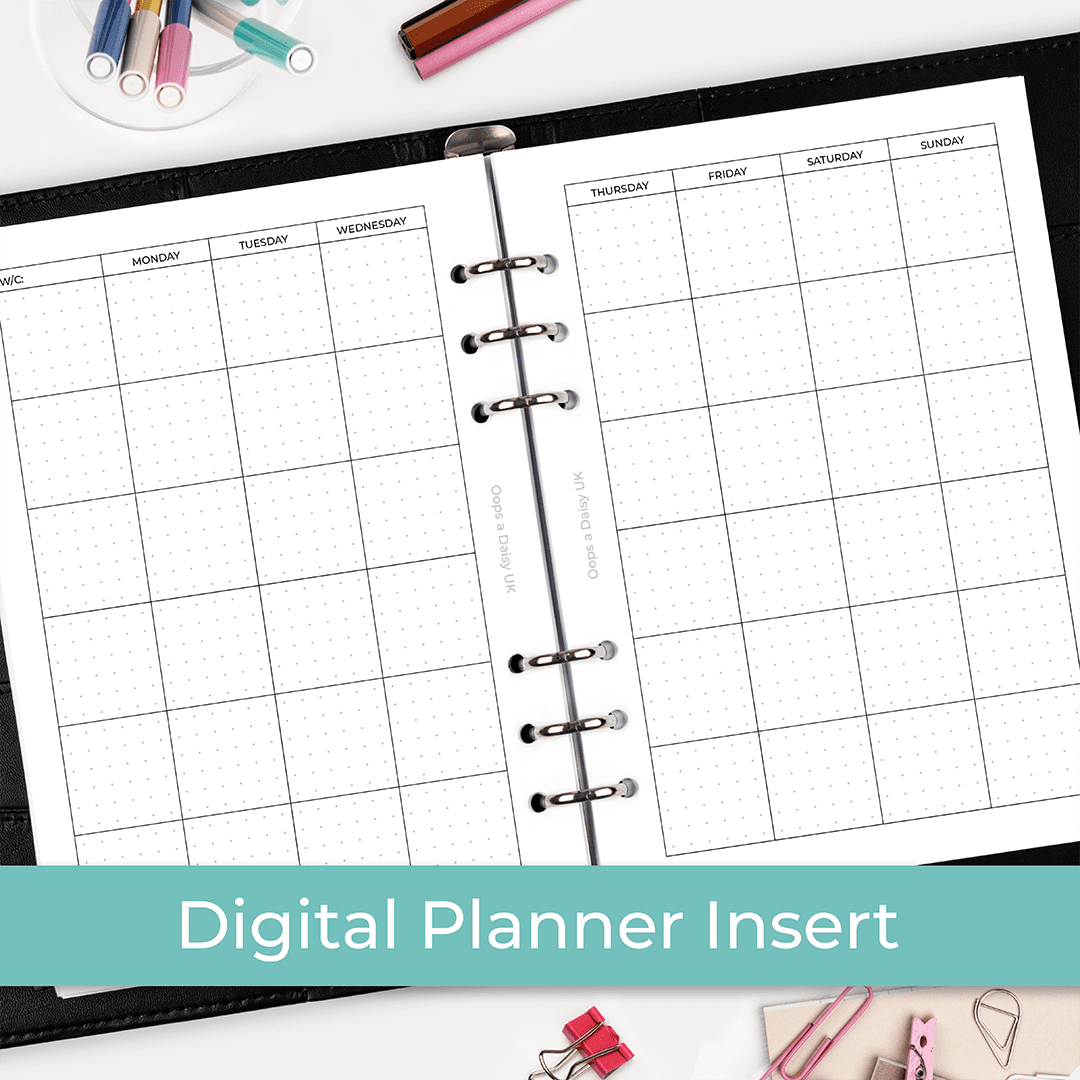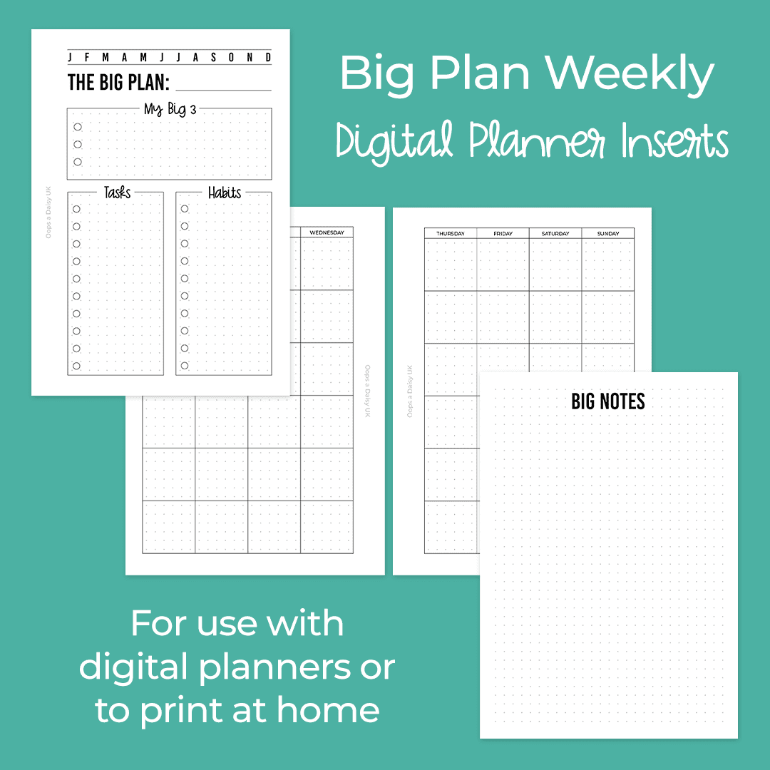 Our Big Plan weekly planner inserts are perfect for when you need to get organised! The multiple rows can be used as a family organiser, social media planner, school or teacher diary, or to plan your meals and snacks! Choose from Monday or Sunday start, and a variety of punch styles to fit your planner.