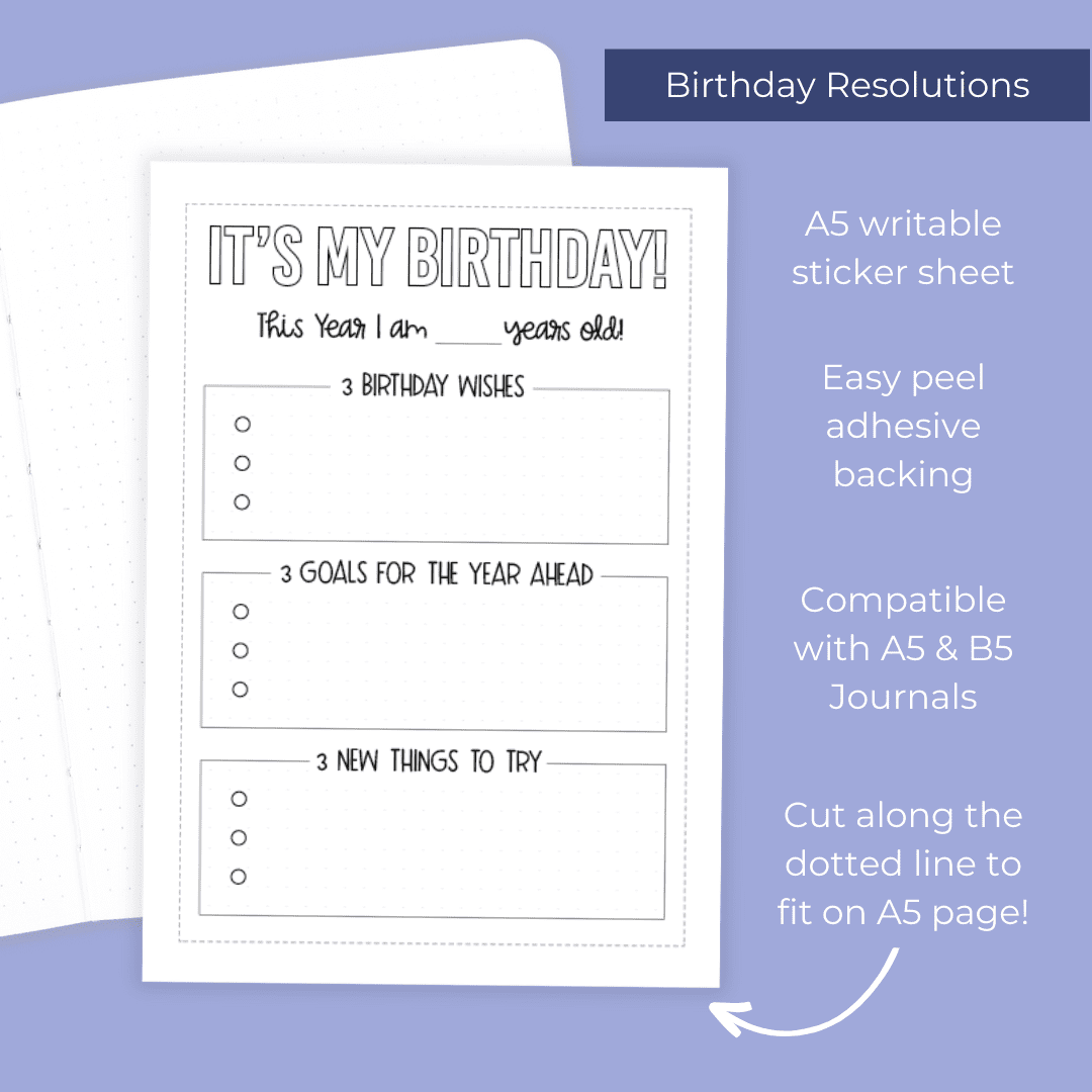 This “It’s My Birthday!” full-page journal sticker adds a fun, celebratory page to your planner or journal, perfect for marking birthdays in a way that feels personal and memorable. Designed to cover a full page, it gives you space to record your age for the year, jot down three birthday wishes, set three goals for the year ahead, and note three new things you’d like to try as you head into the next chapter.