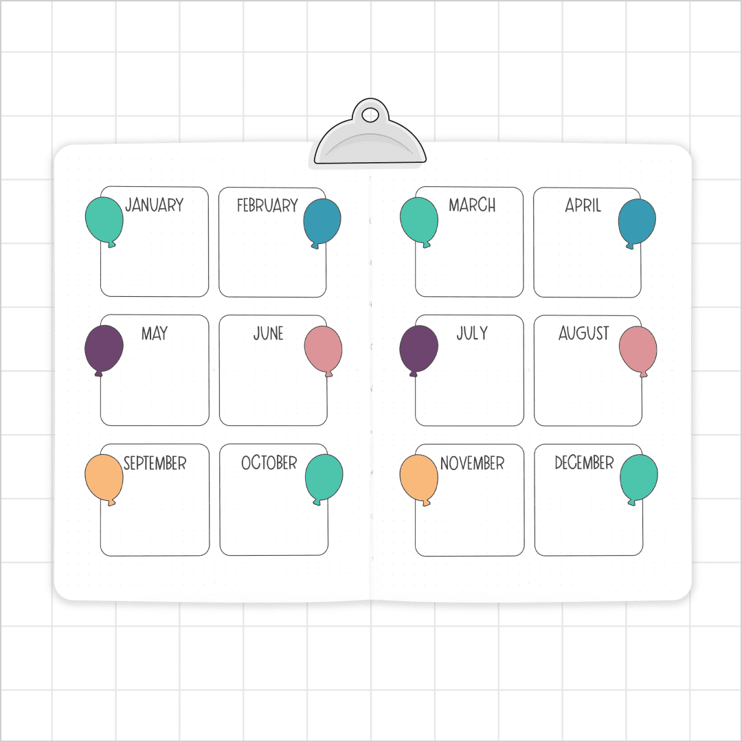 This stencil is perfect for creating an annual birthday log in your Bullet Journal. Simply lay the stencil on the page and trace all the balloons, then flip horizontally and trace the balloons onto the other side of the page. Now add in the boxes behind the first three balloons. Flip again to place the final three boxes behind their corresponding balloon!