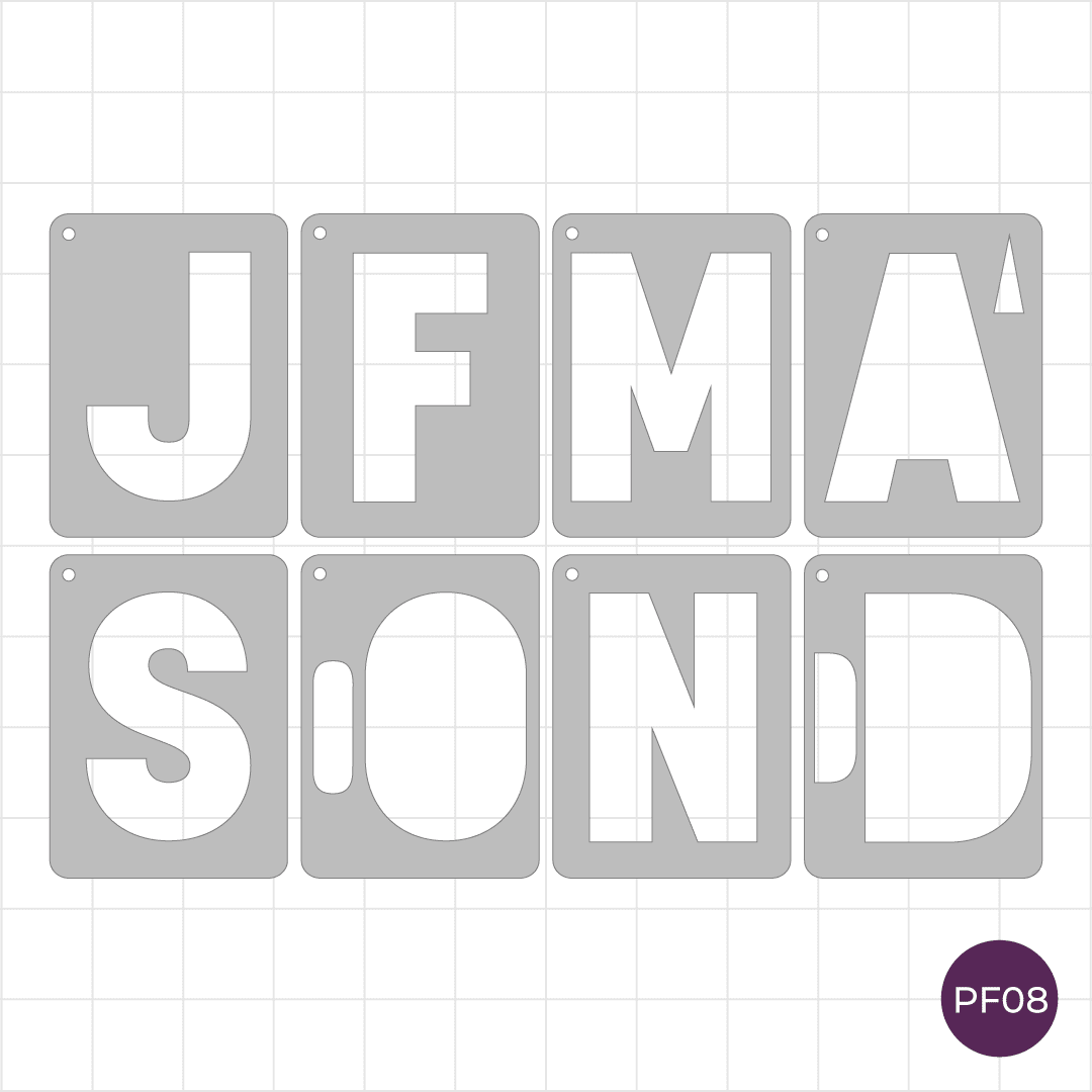 This set contains 8 pocket-sized stencils featuring all the letters needed for monthly cover pages, in 10cm high letters in our classic ‘Block’ font.