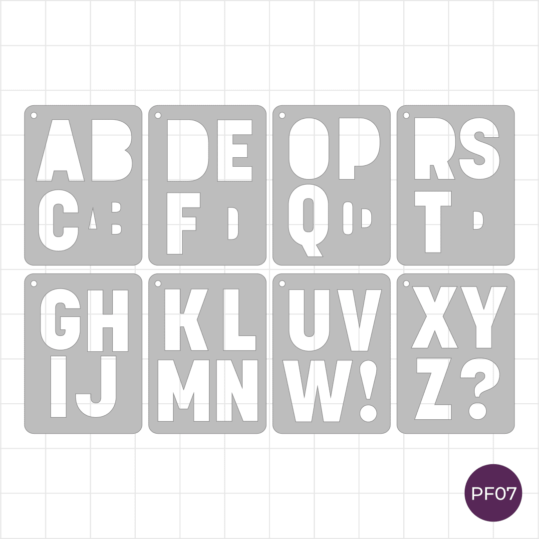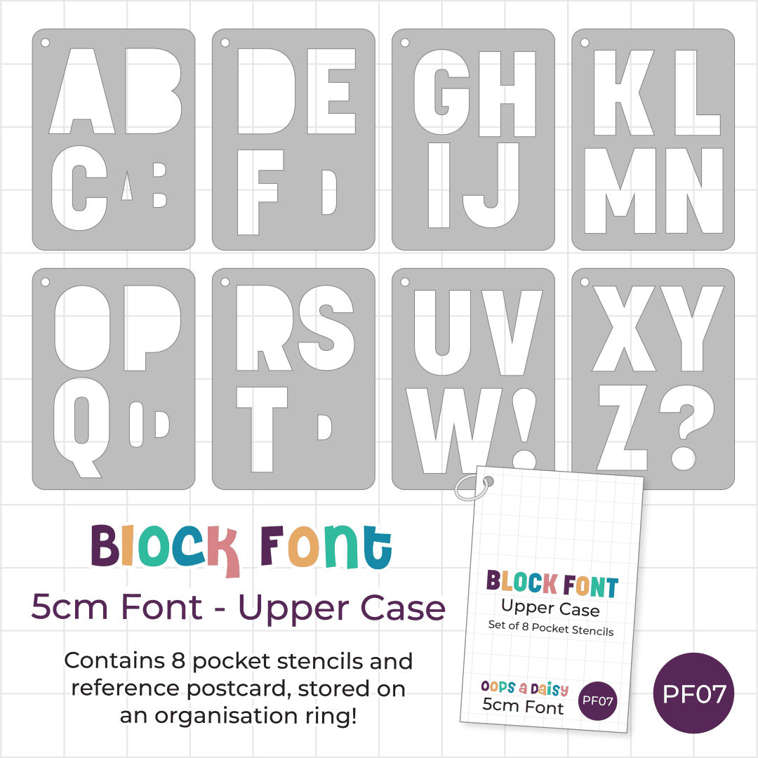 This set contains 8 pocket-sized stencils featuring an entire upper case alphabet with 5cm tall letters in our classic ‘Block’ font.