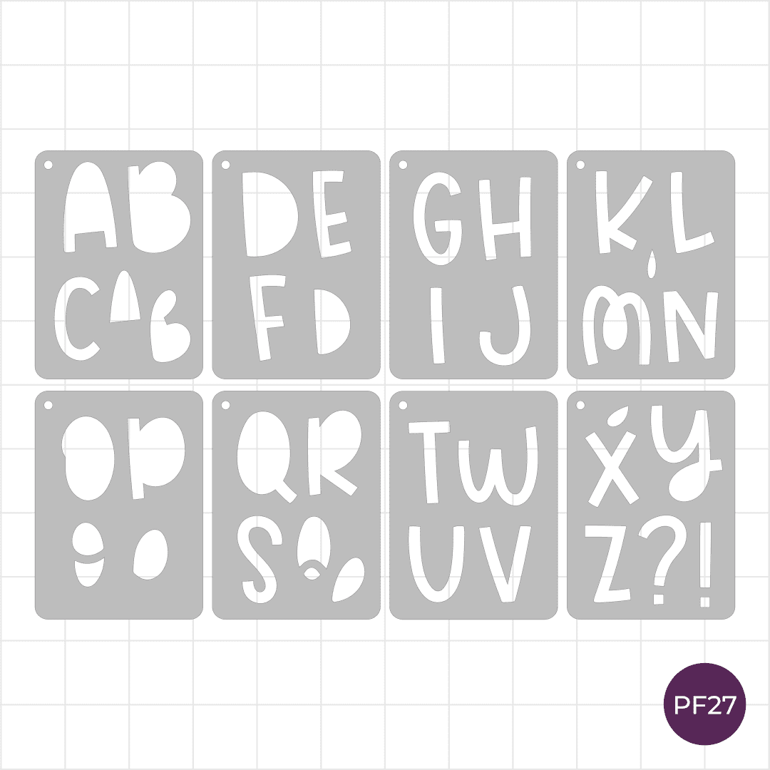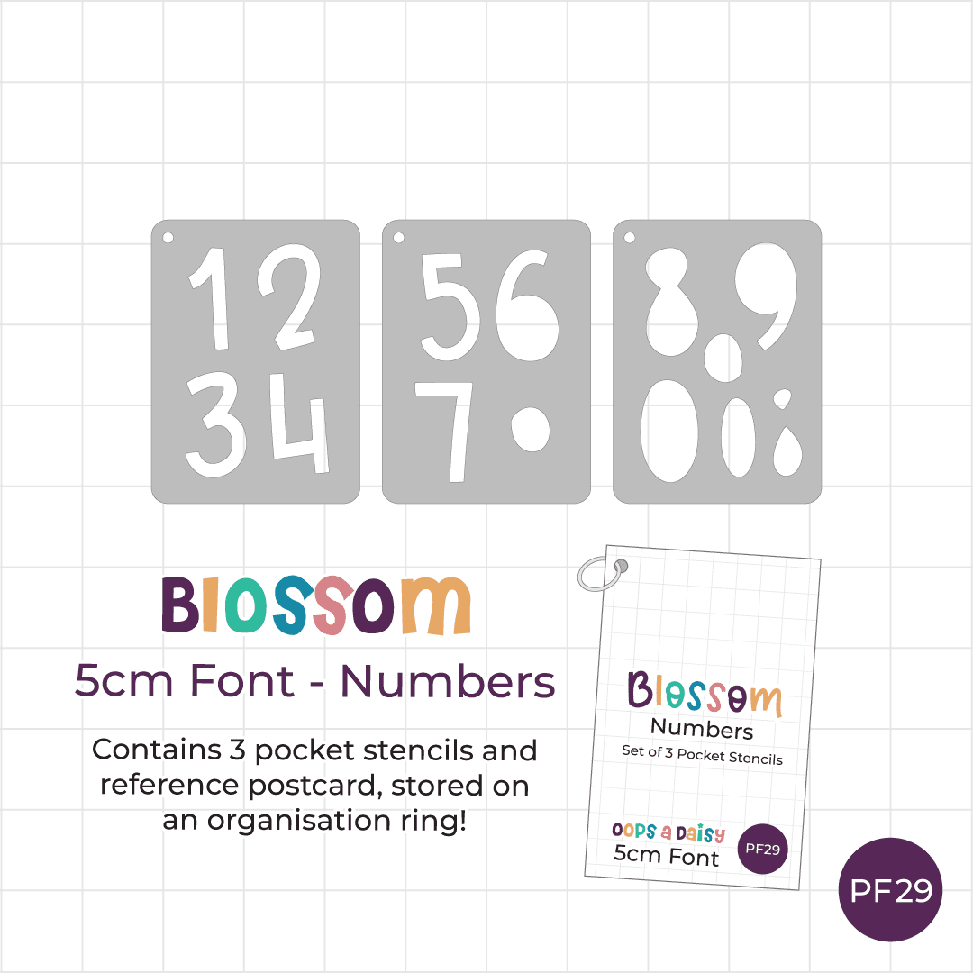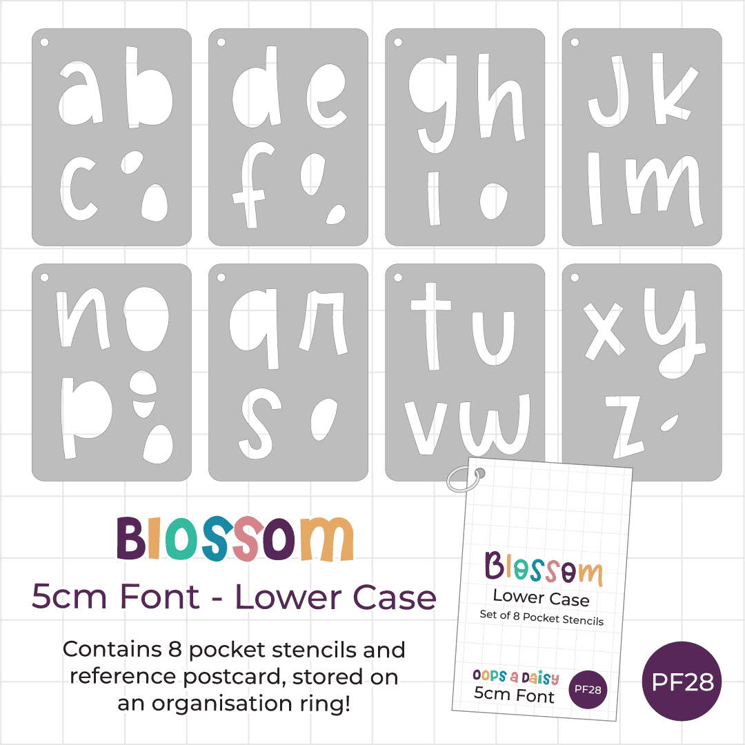 These sets of pocket-sized stencils features 5cm high letters in our fun “Blossom” Font, in sets of upper case, lower case, and numbers.
