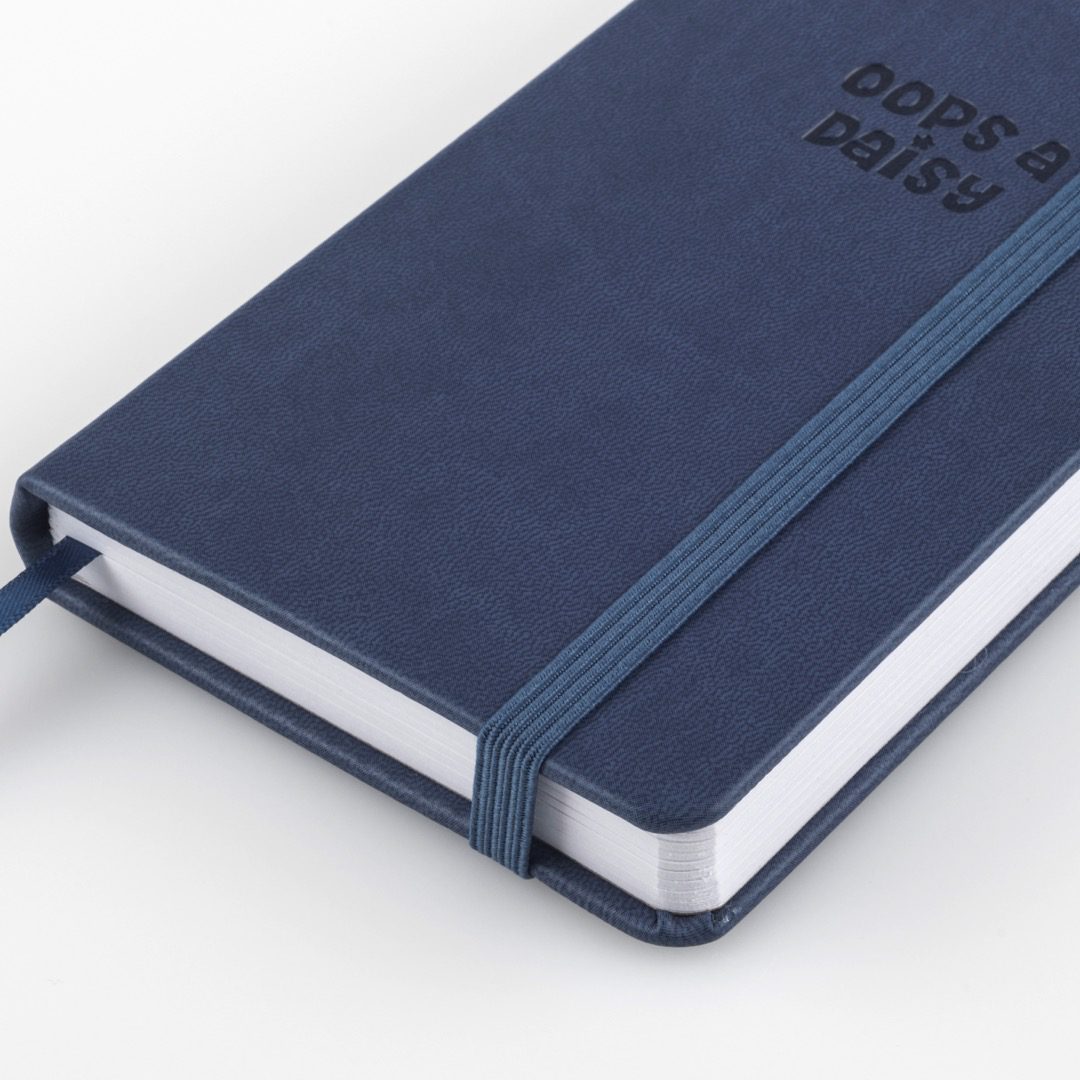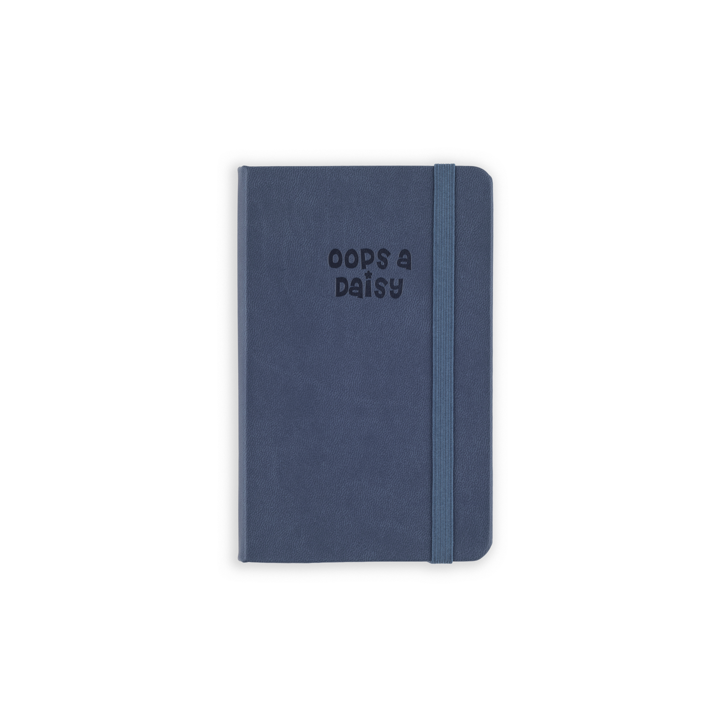 A gorgeous pocket-sized journal with a blueberry blue faux-leather cover, de-bossed with the Oops a Daisy logo.