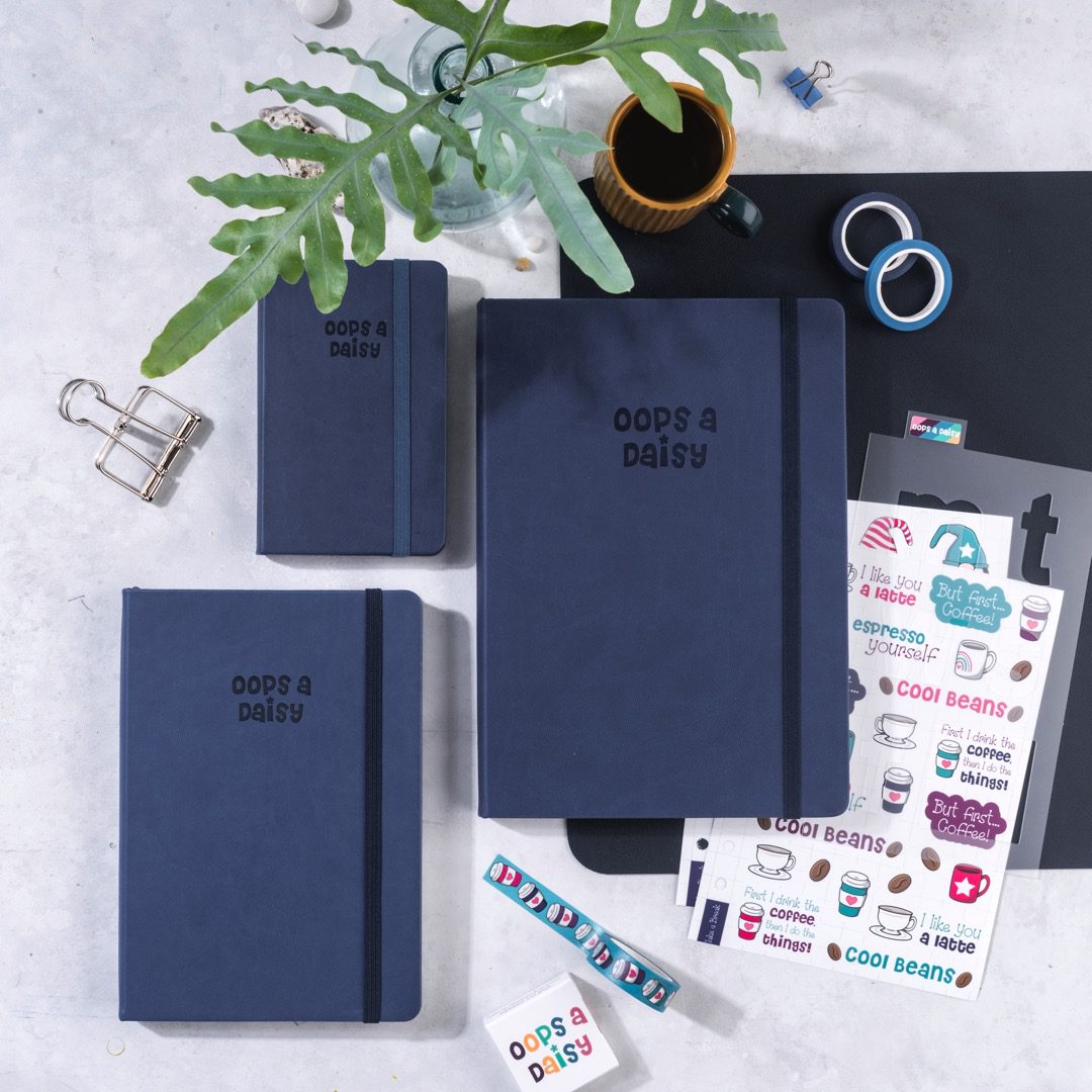 This A6 dotted journal features a gorgeous blueberry blue faux-leather cover, de-bossed with the Oops a Daisy logo.