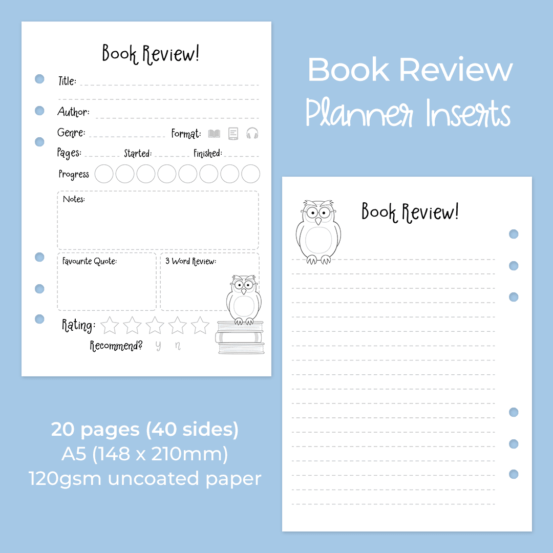 Our book review planner inserts are perfect for all bookworms! With plenty of space to write all the important details of your latest read, and a notes page on the back to add pictures and more.