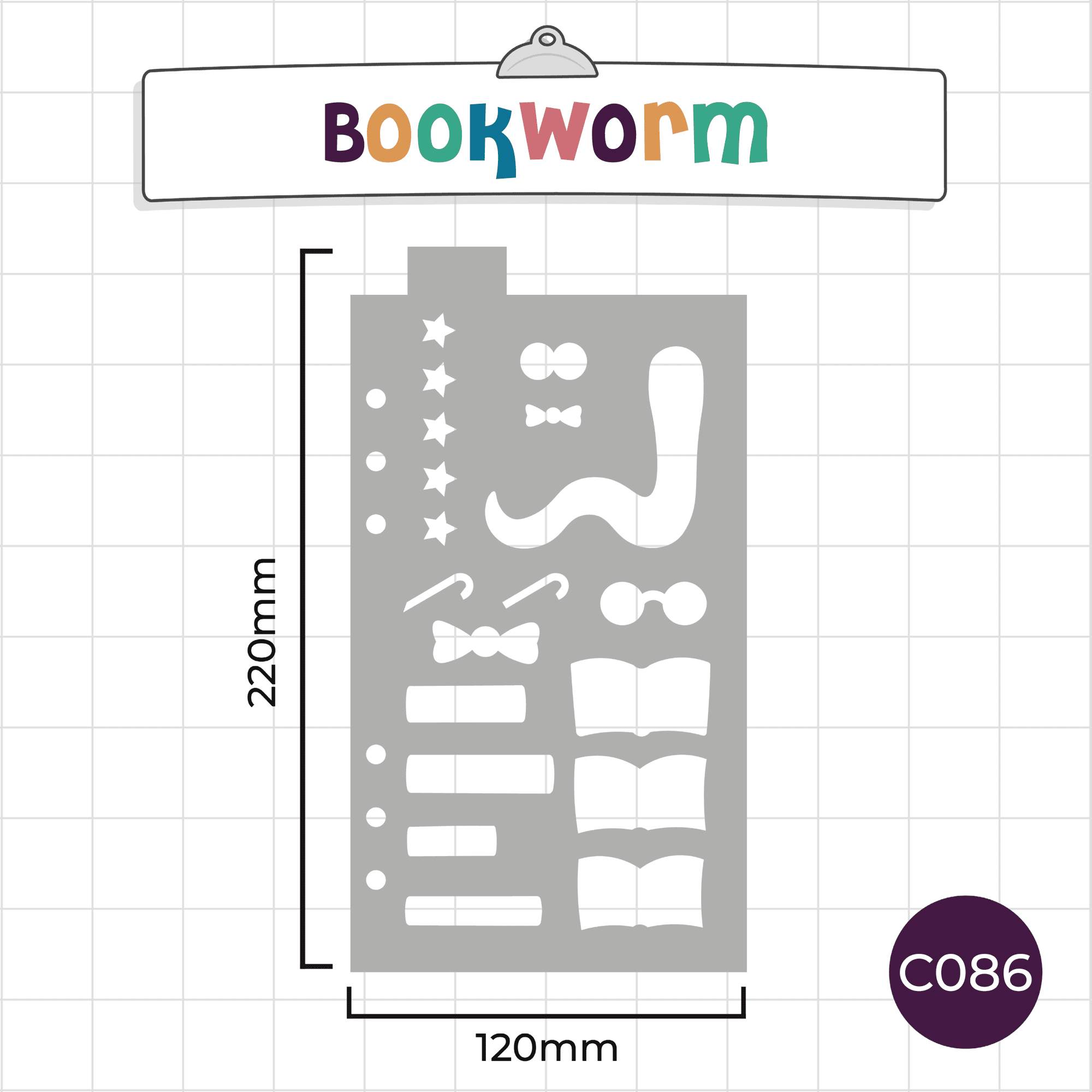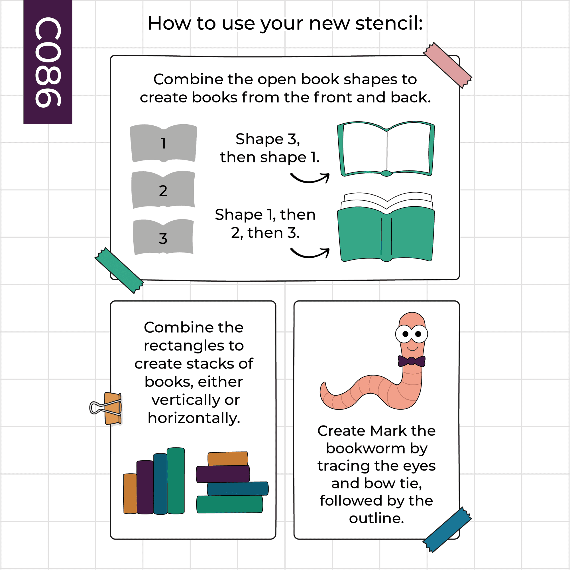 Calling all bookworms! This handy journal stencil can be used to create and decorate a book-themed spread in your bullet journal. Featuring Mark the bookworm (plus accessories to dress him!), as well as five stars to help you write reviews, a stack of books, and open books to layer up and create fun decorations.