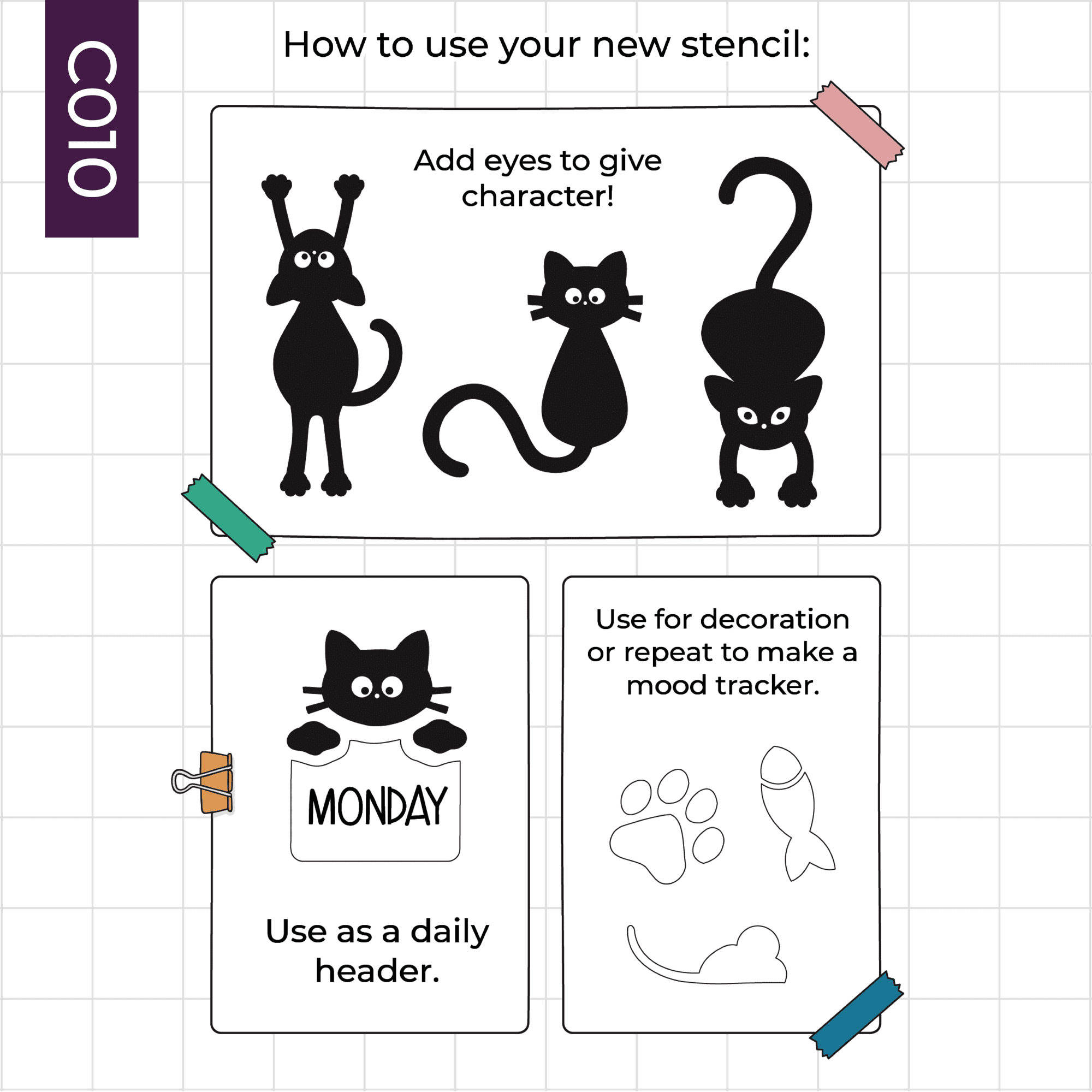 This cat-themed journal stencil helps you decorate your bullet journal spreads with cute cats and kittens – No artistic talent required! Check out the gallery some feline journal inspiration!