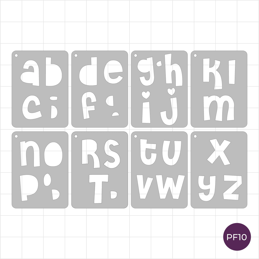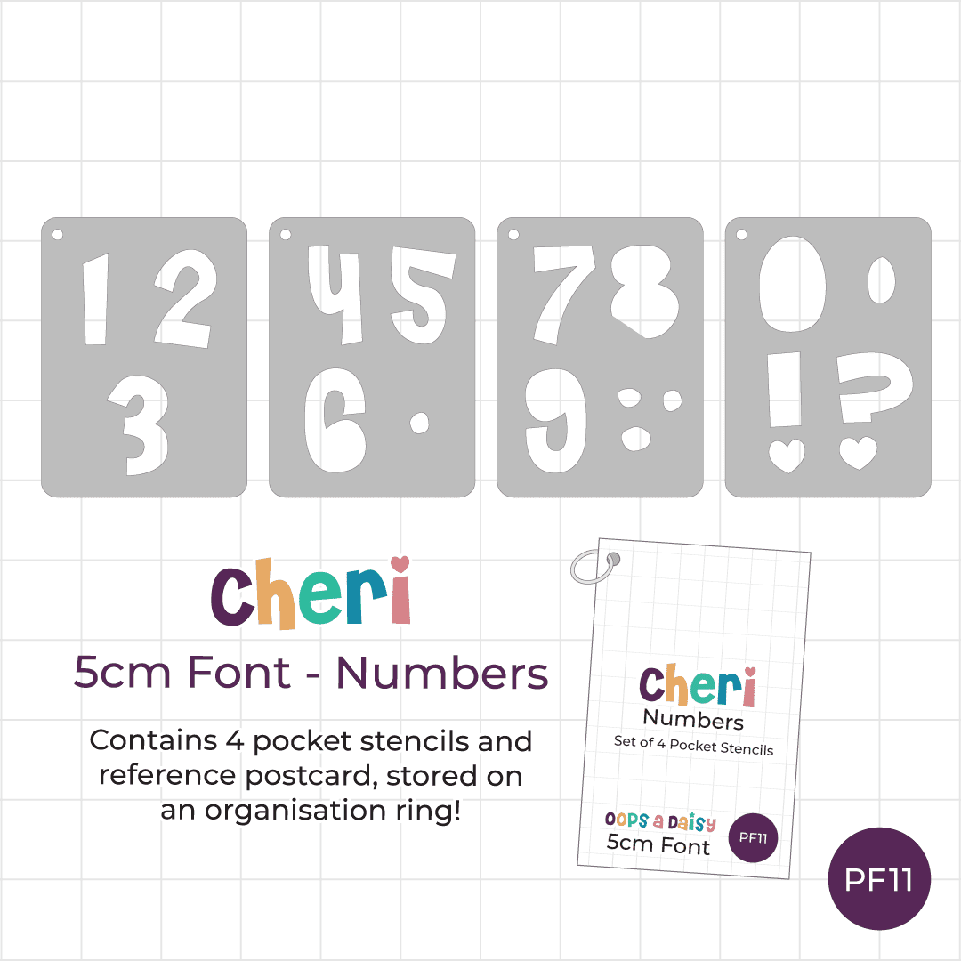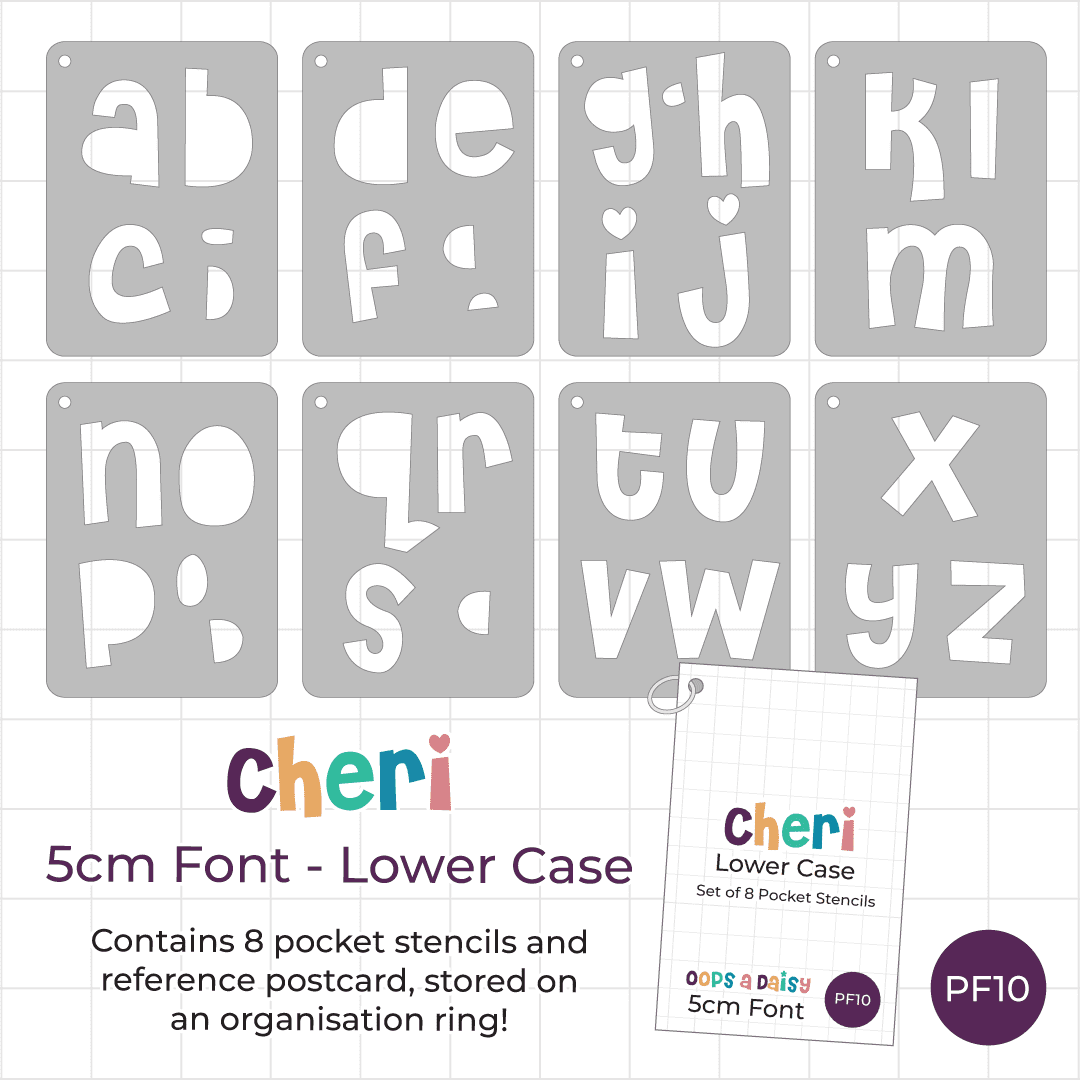 These sets of pocket-sized stencils feature 5cm high letters in our funky ‘Cheri’ Font, in sets of upper case, lower case, and numbers.