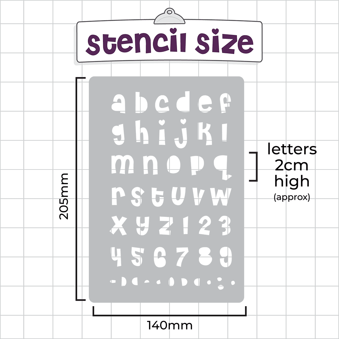 Available as two A5 stencils, with uppercase and lowercase letters, numbers, and punctuation. Designed specifically for journal and planner use, these stencils fit neatly on the page and are easy to align and reuse, helping you create consistent, fun lettering across your spreads.