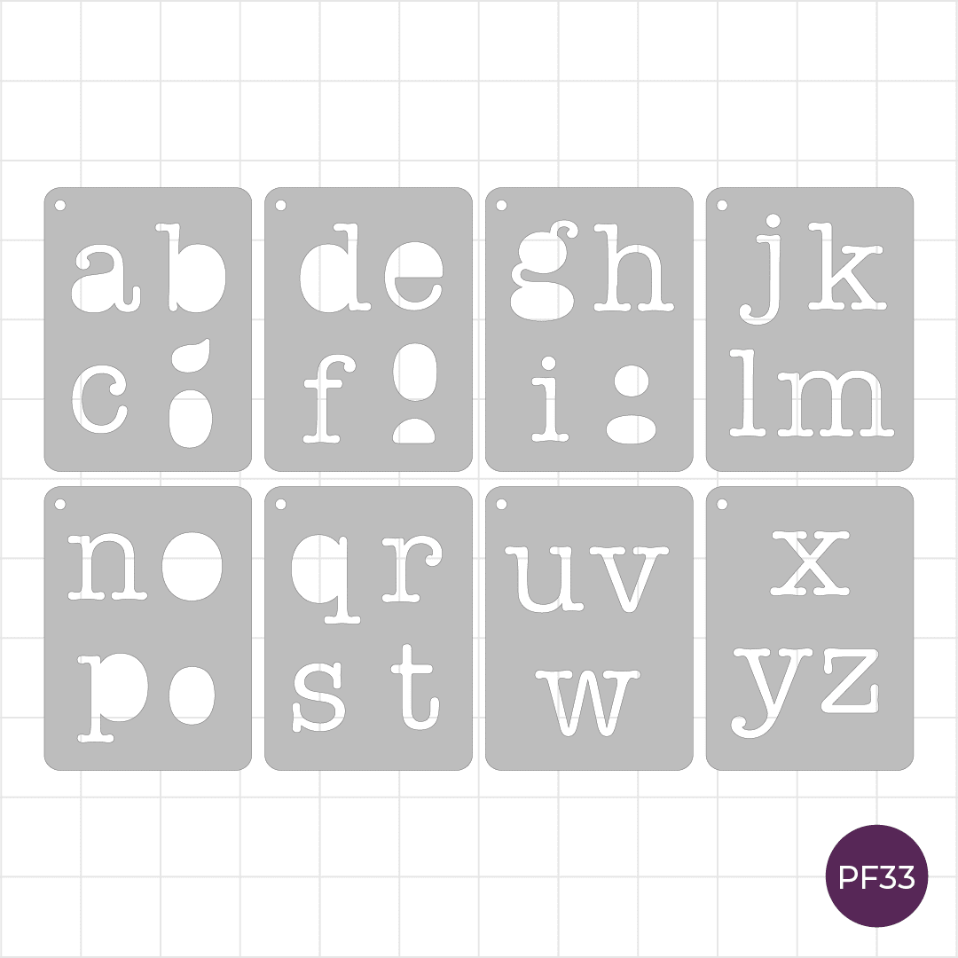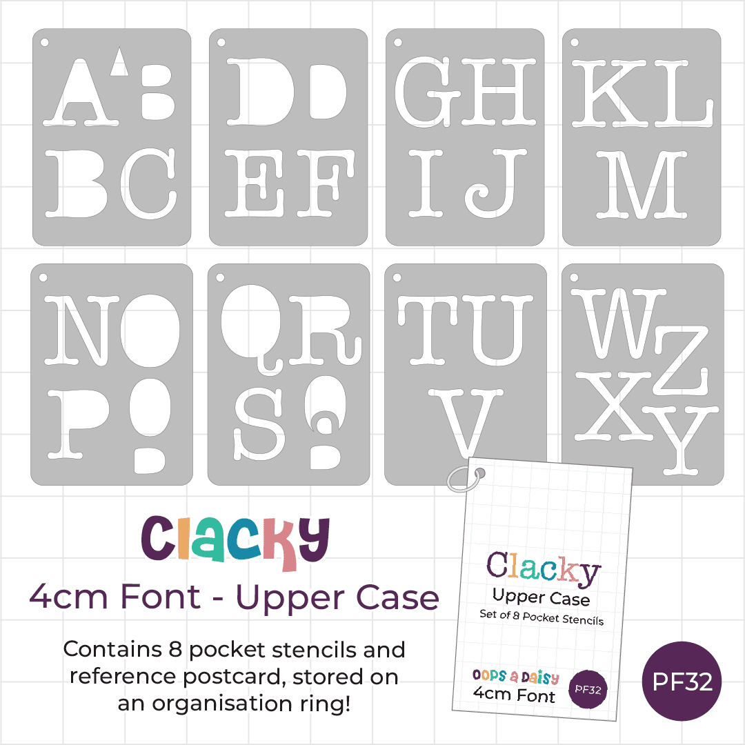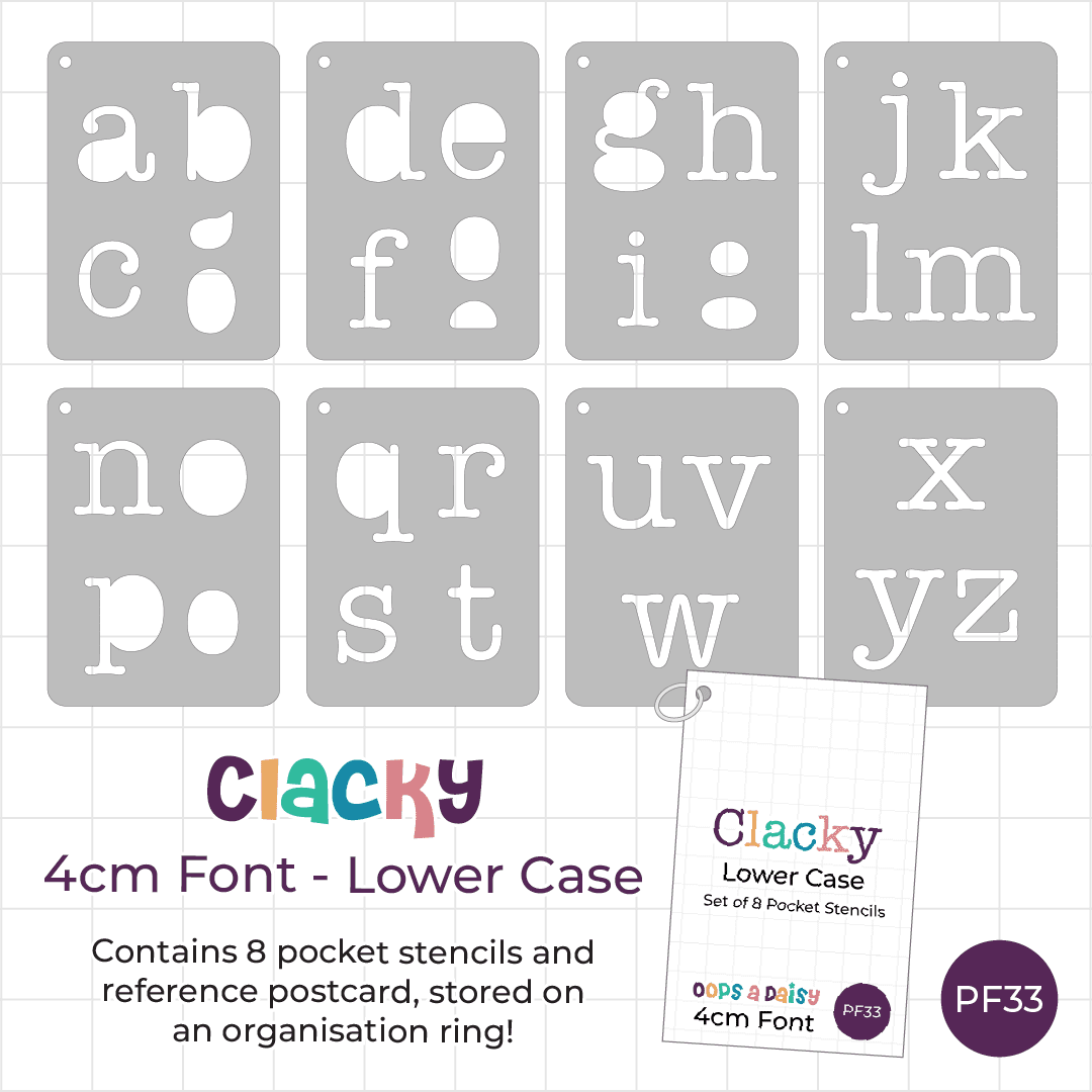 These sets of pocket-sized stencils feature 5cm high letters in our typewriter-style ‘Clacky’ Font, in sets of upper case, lower case, and numbers.