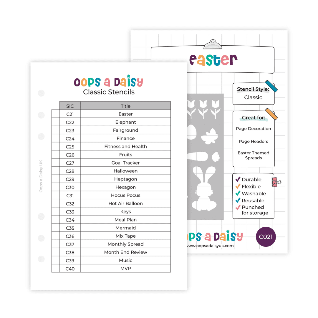 Due to popular demand, we have bundled together 20 of our individual Classic Stencils in a fabulous Oops a Daisy Storage binder, saving a massive 30% on the RRP of the individual items.