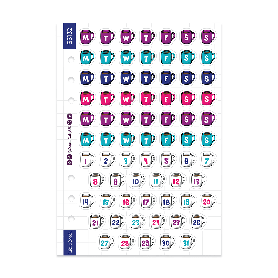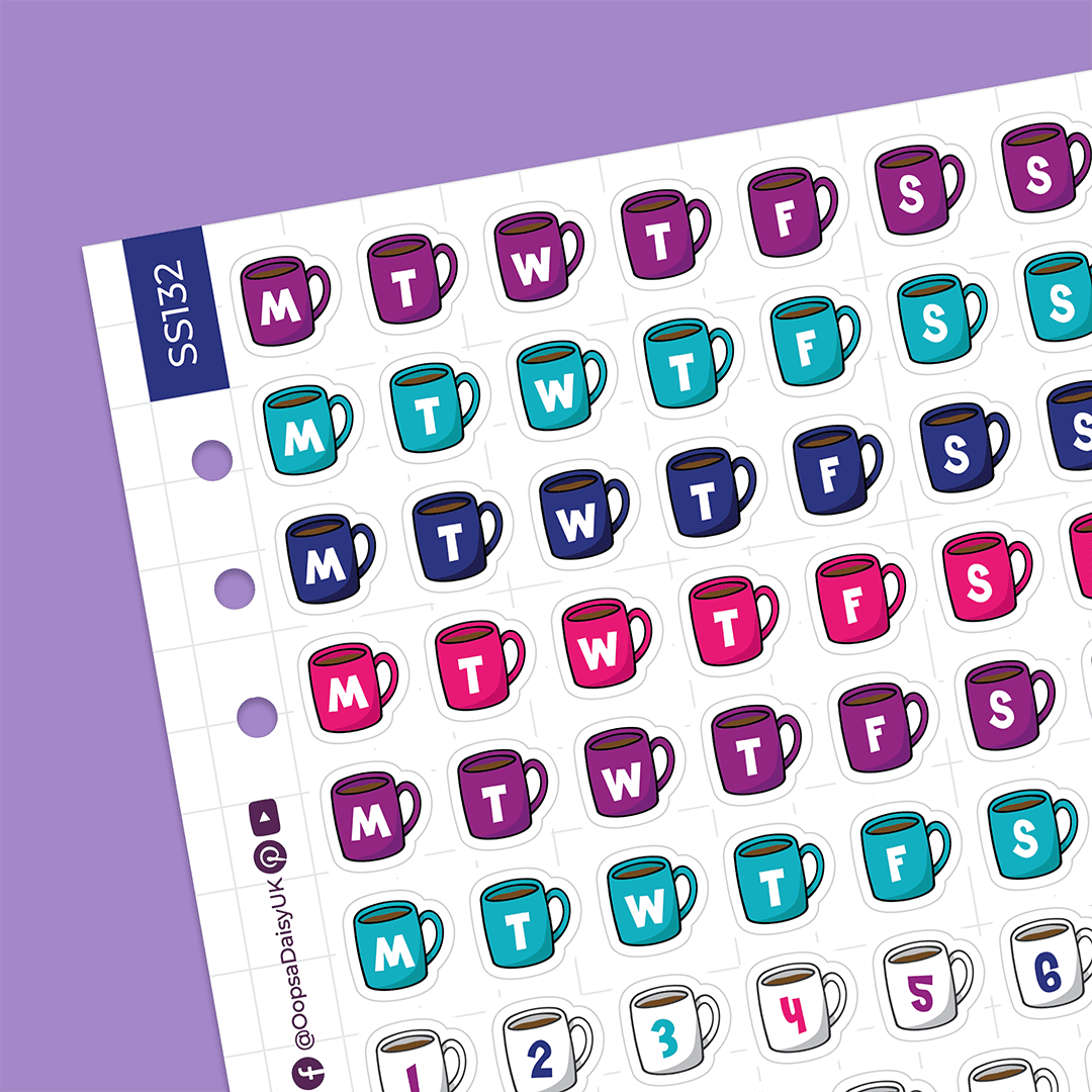 Brighten up your journal or planner with these super cute coffee mugs featuring the days and dates in our signature “Cheri” font. The sheet includes 73 stickers in total, with a bold purple and blue colour scheme.