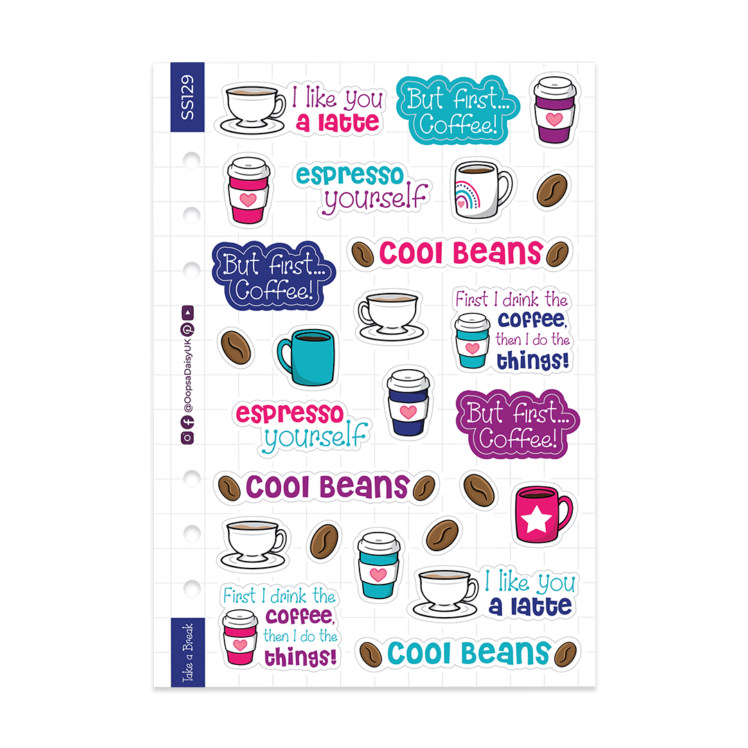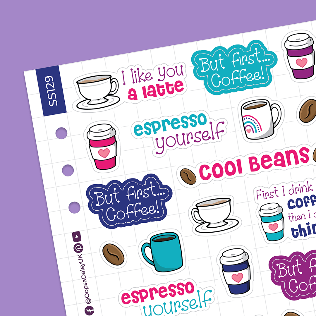 Brighten up your journal or planner with these super cute coffee themed stickers. The sheet includes 26 stickers in total, with 5 different quotes in a bold purple and blue colour scheme.