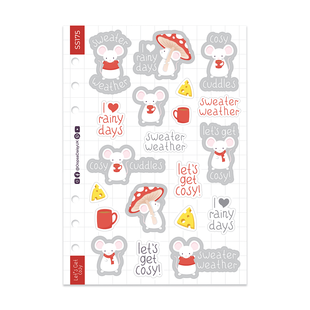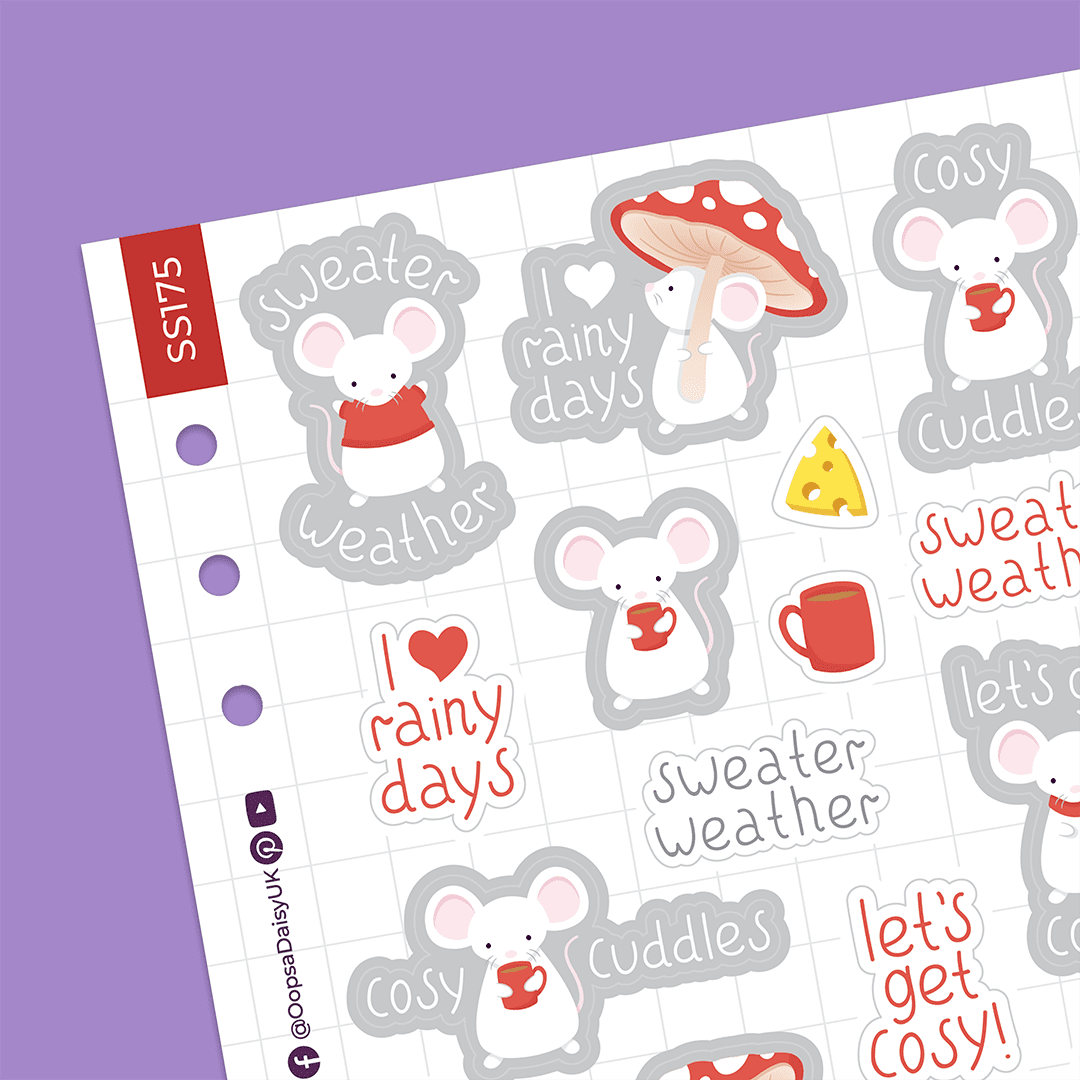 Make your journal cosy and cute with these autumn-themed stickers, featuring our adorable mouse character and a variety of cosy quotes.
