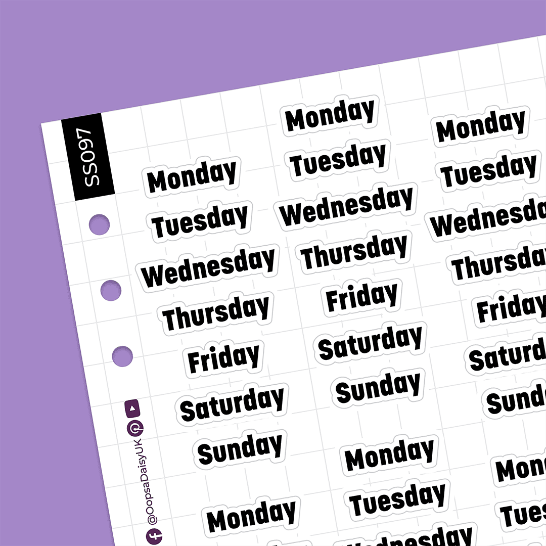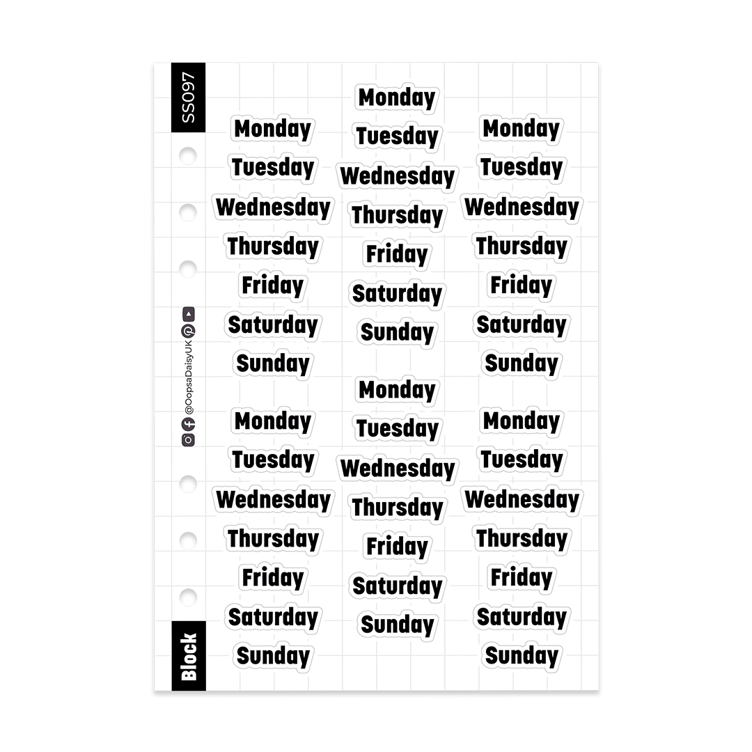 Make quick work of your journal spreads with these daily header stickers. Featuring our ‘Block’ font, these sleek black lettering stickers work with any theme or colour scheme.