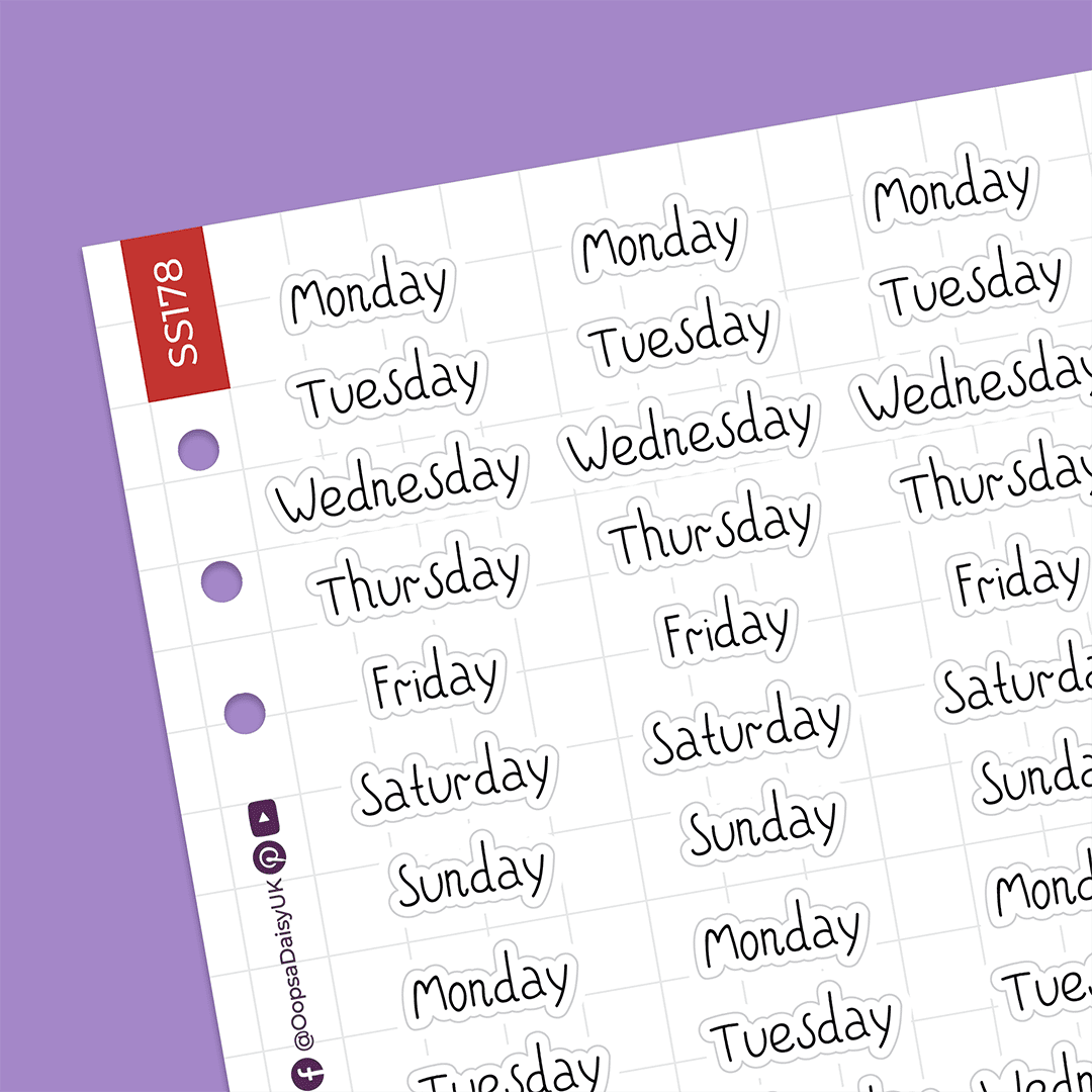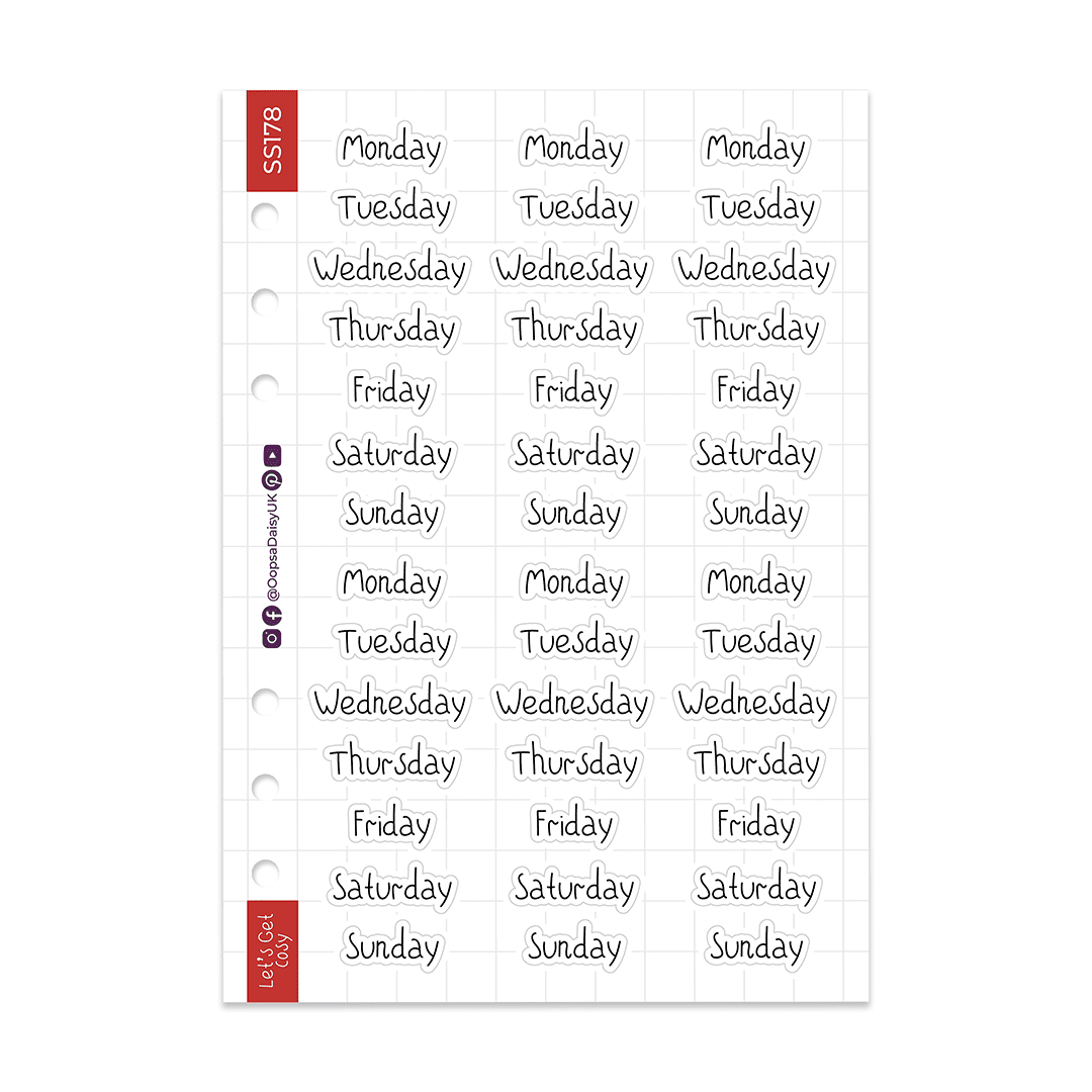 • Contains 6 sets of the days the week, from Monday to Sunday.