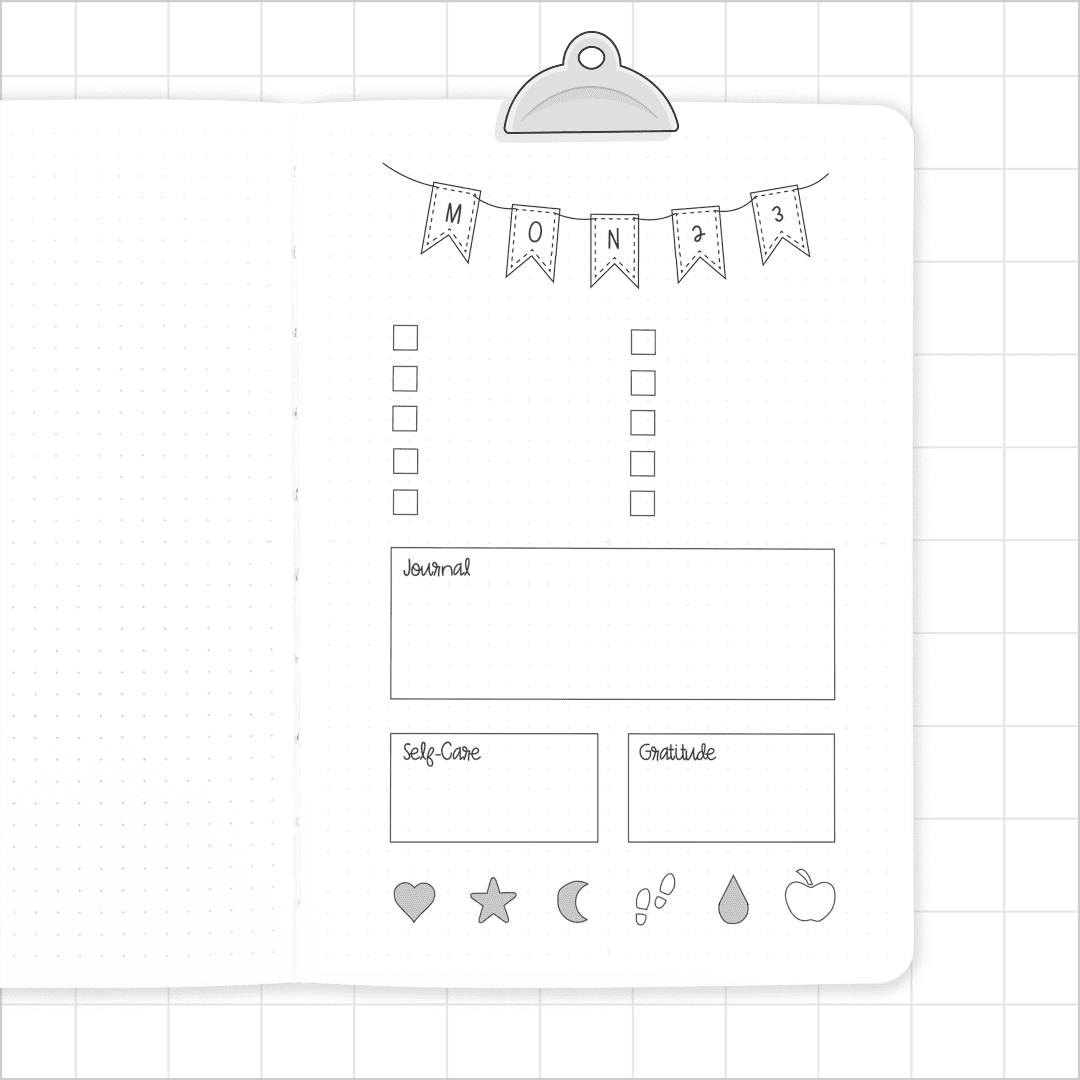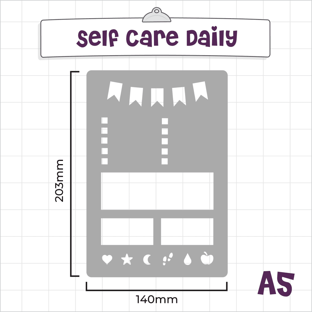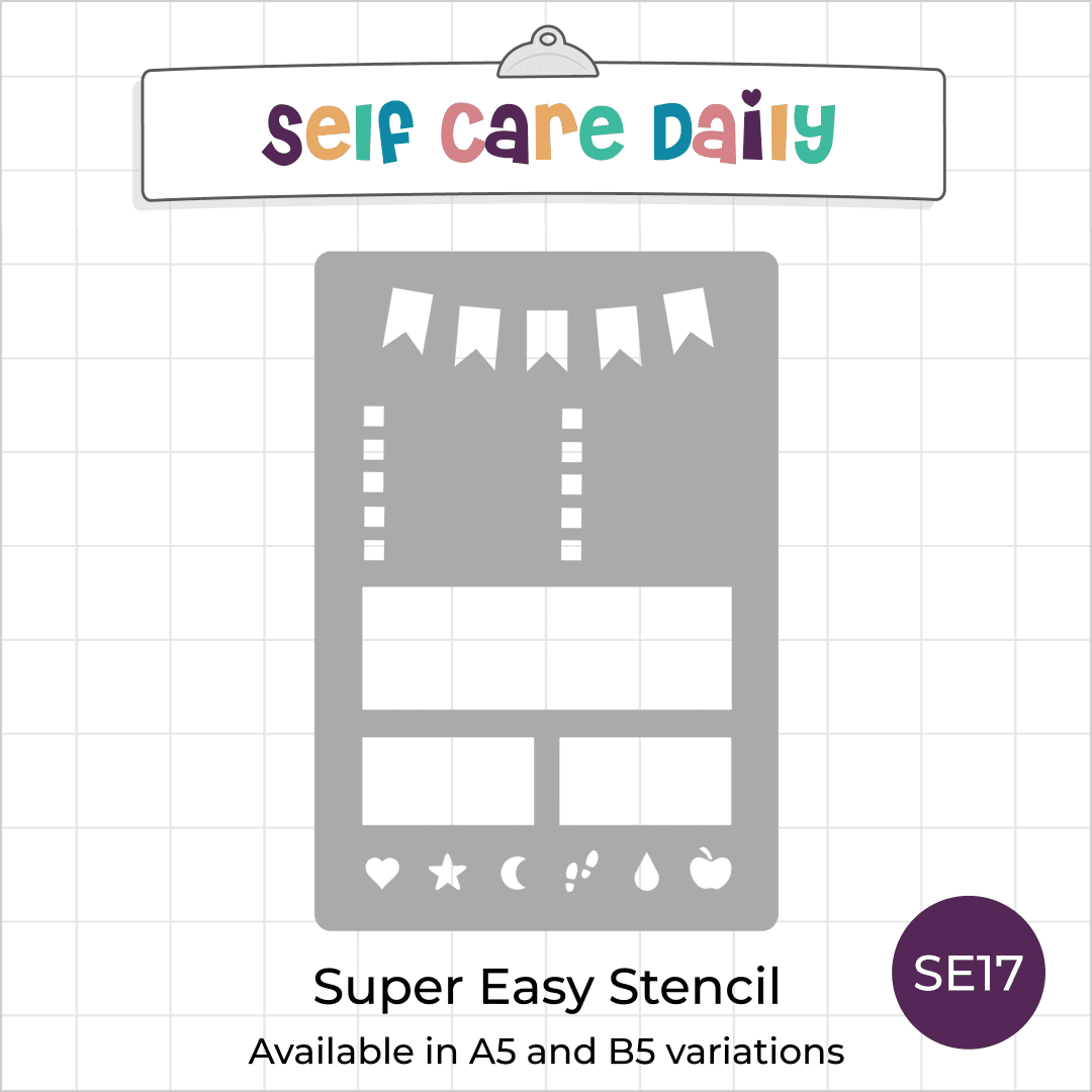 This journal stencil contains elements to help you create a daily journal spread focused on self care, with icons for steps, stars and hearts which you can personalise however you like.
