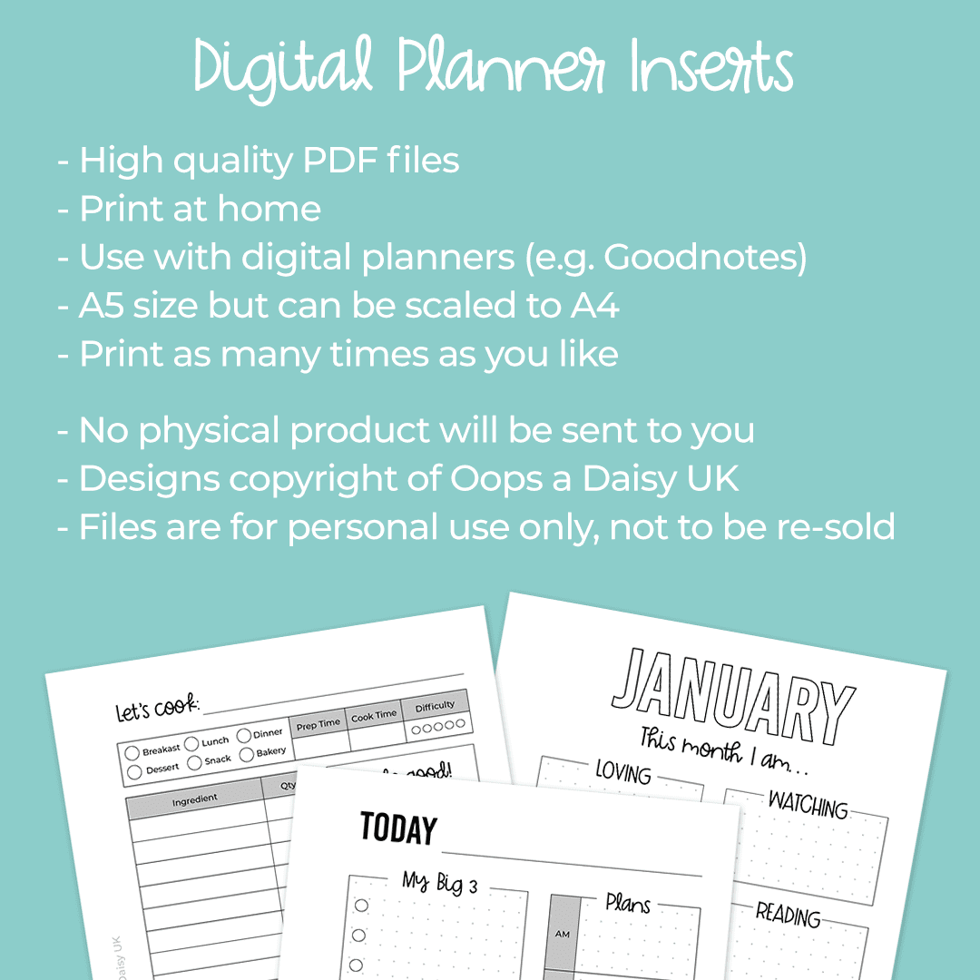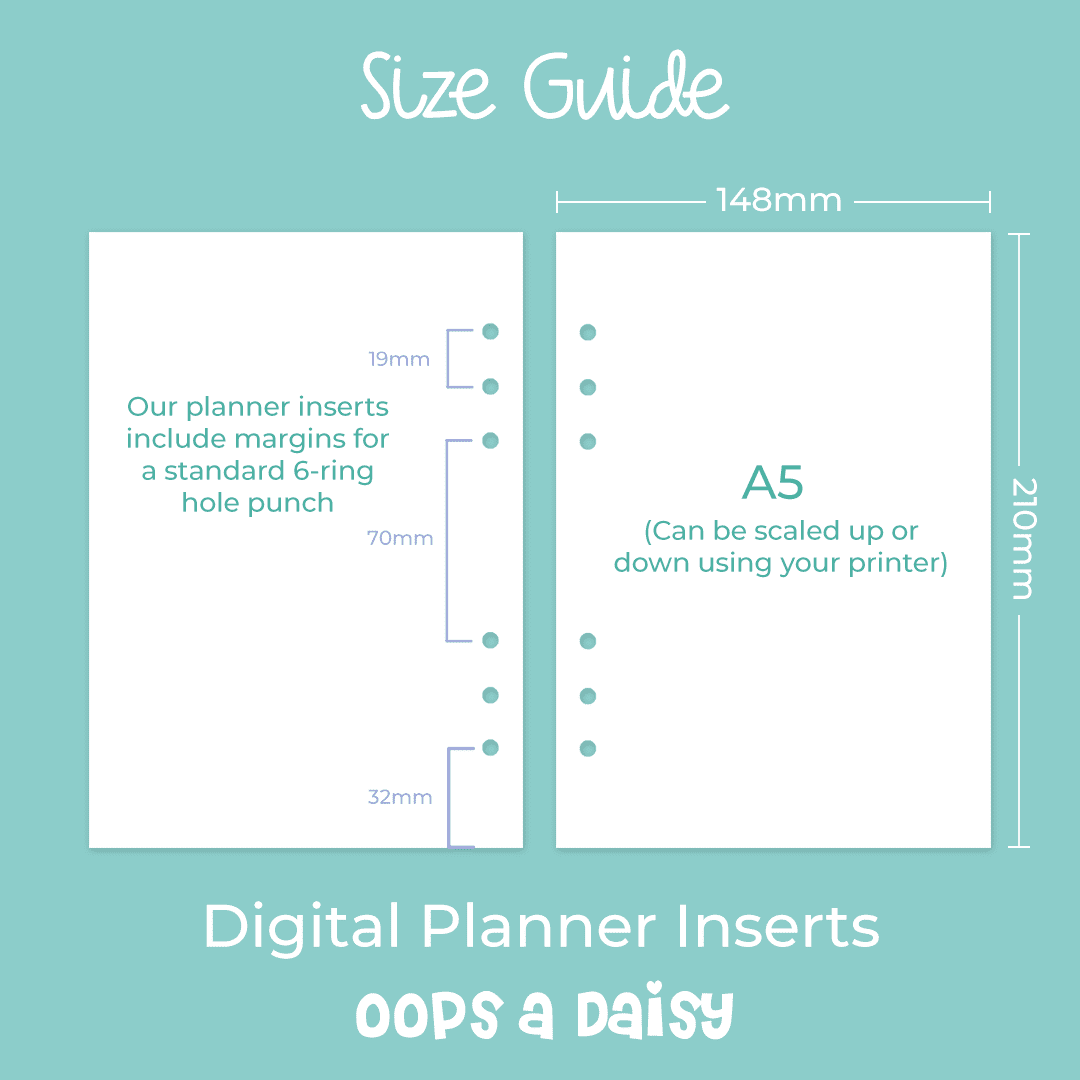 Combine our planner inserts to create your perfect planner or diary! All of our inserts are designed so that, if desired, you can decorate with Washi tape and stickers, add colour, and customise to your specific needs.