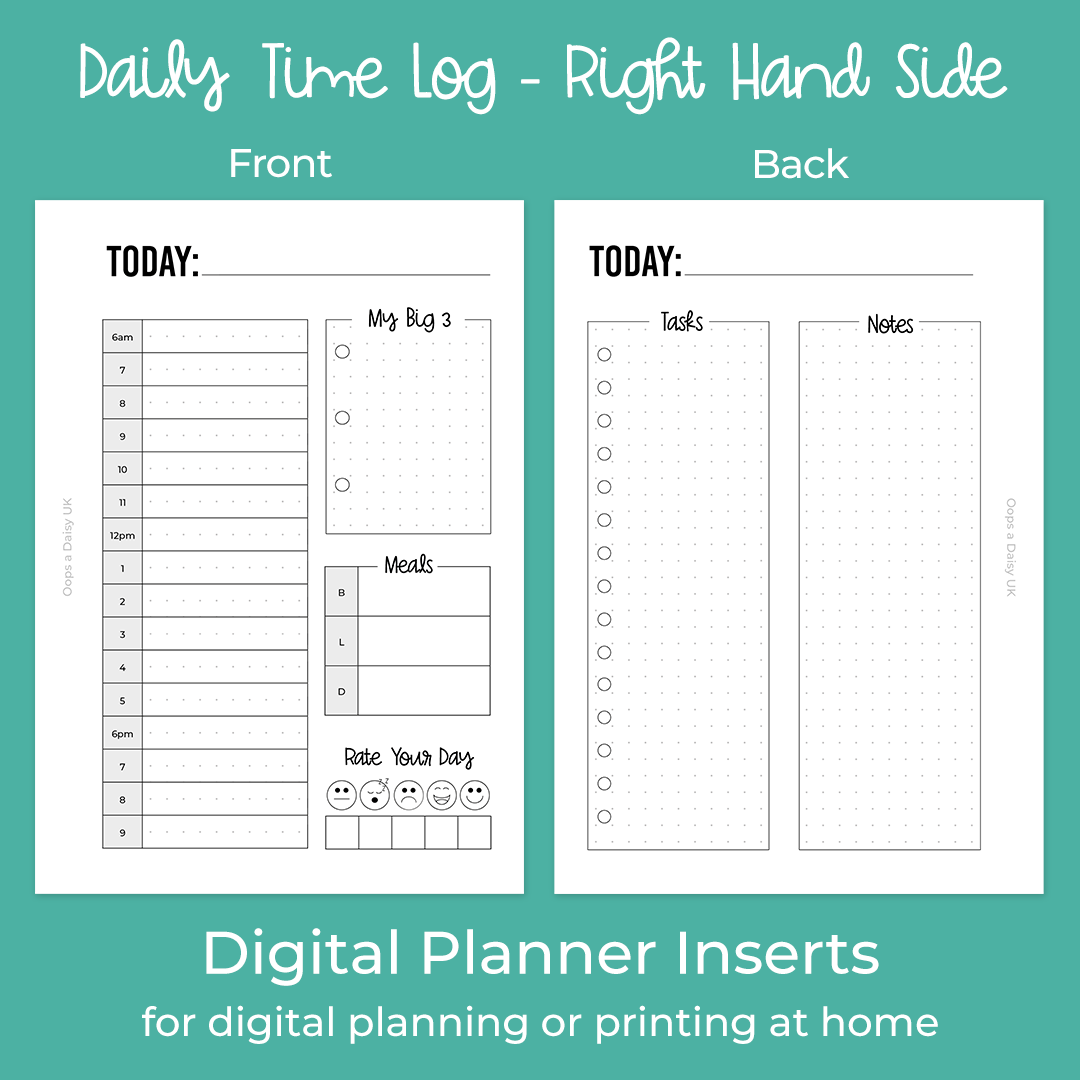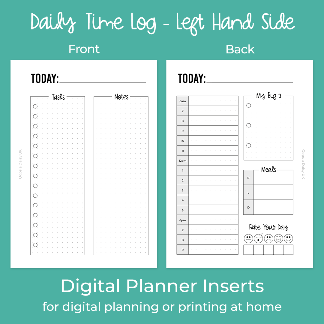 Our daily spread with time log is great for busy days! Alongside a time log which runs from 6am until 9pm, there is space for your big 3 tasks, meal plan, and mood tracker, plus a task list and space for notes on the reverse. Available in left-hand or right-hand side versions.