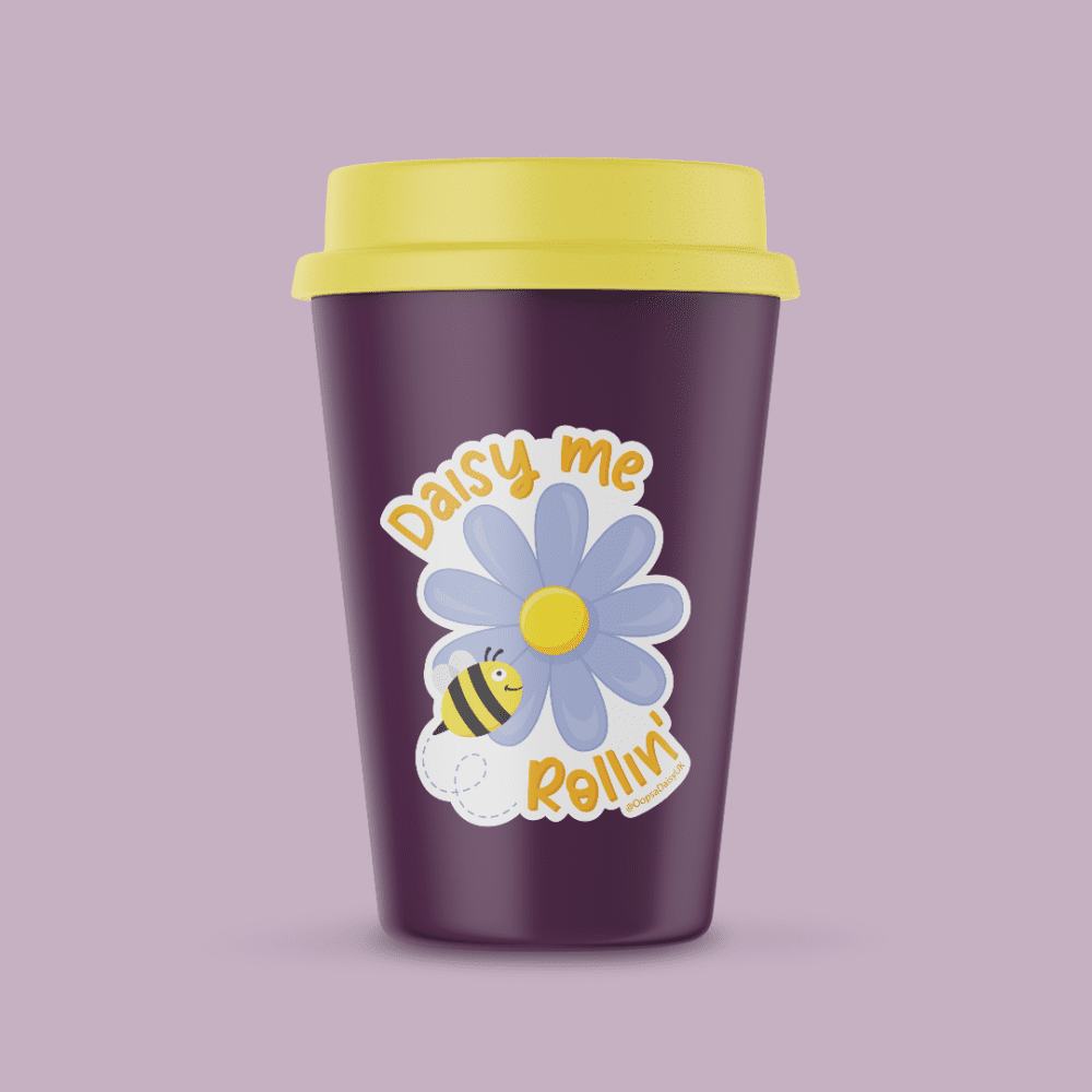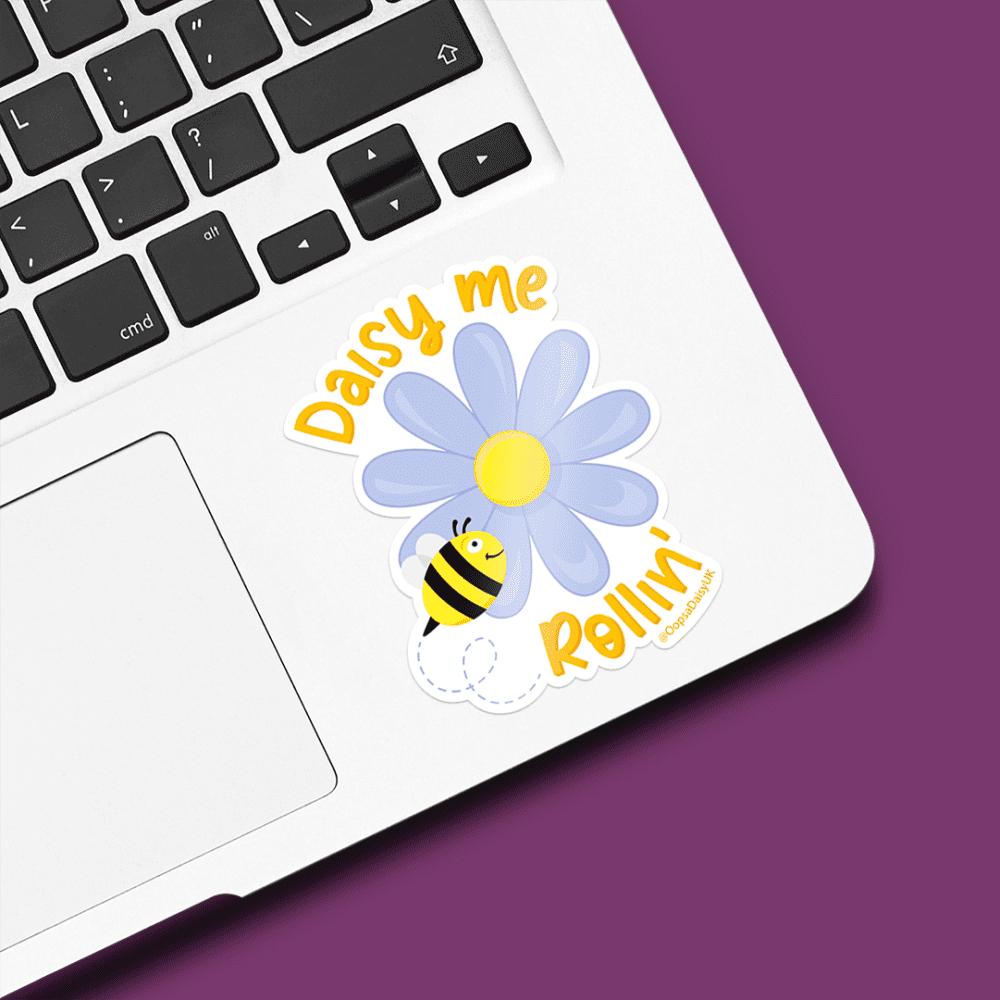 This vinyl sticker features our super cute Bee and Daisy with the text “Daisy Me Rollin'”.