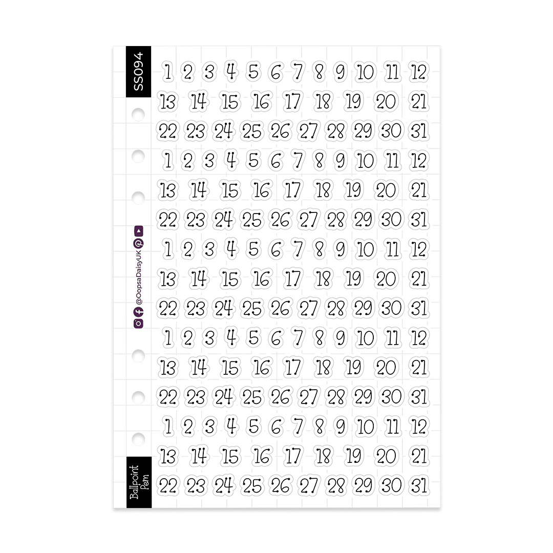 About the Dates 1-31 – Ballpoint Pen Font – Monochrome – A5 Sticker Sheet