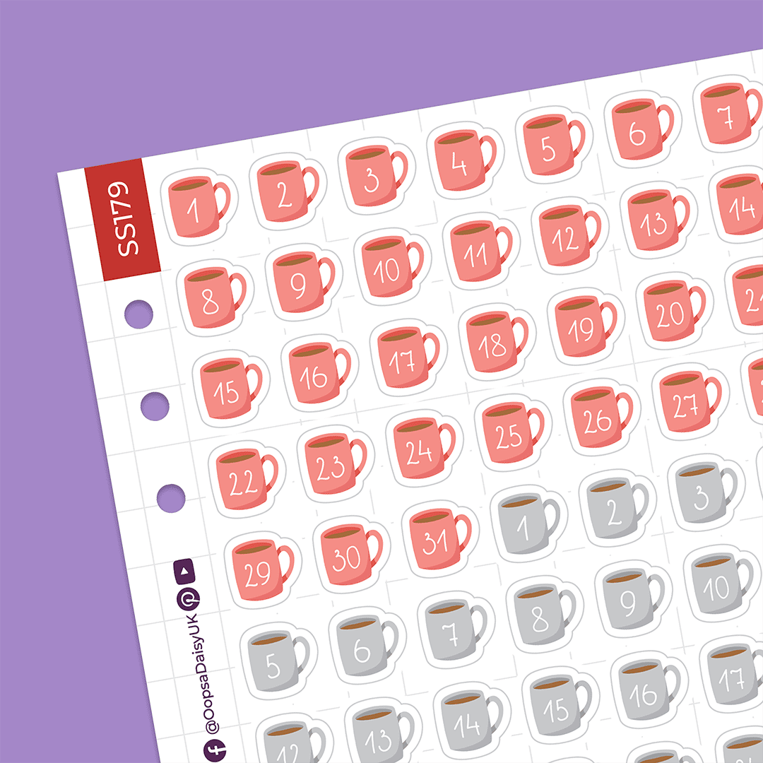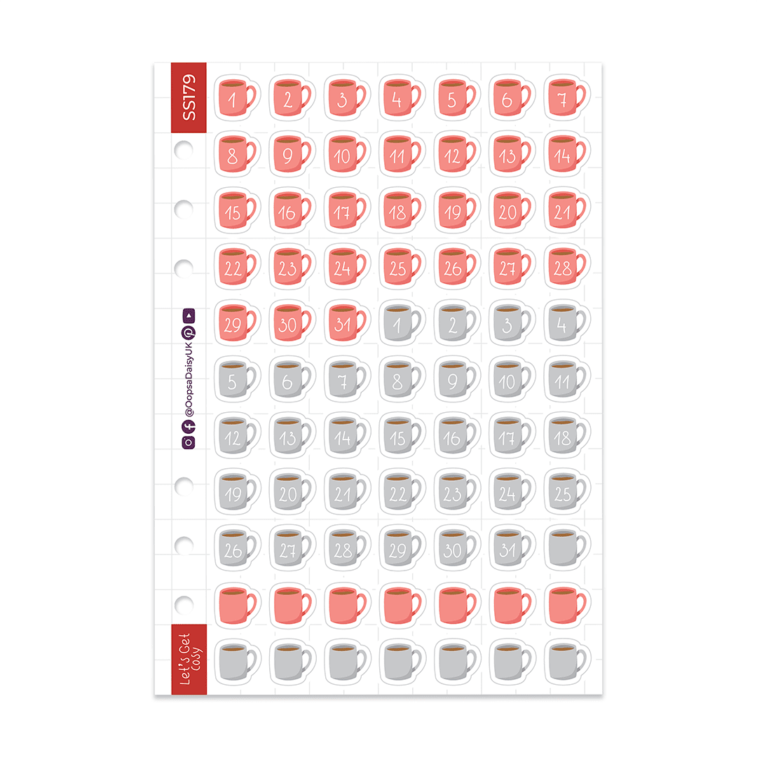 Make quick work of your journal spreads with these date stickers. Featuring our ‘Get Cosy’ font, each number is featured on a cute red or grey mug, for a cosy autumnal vibe.