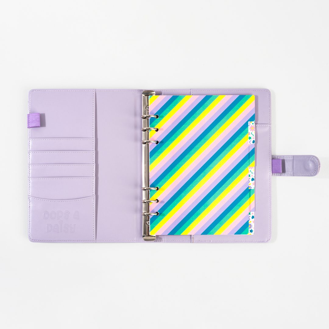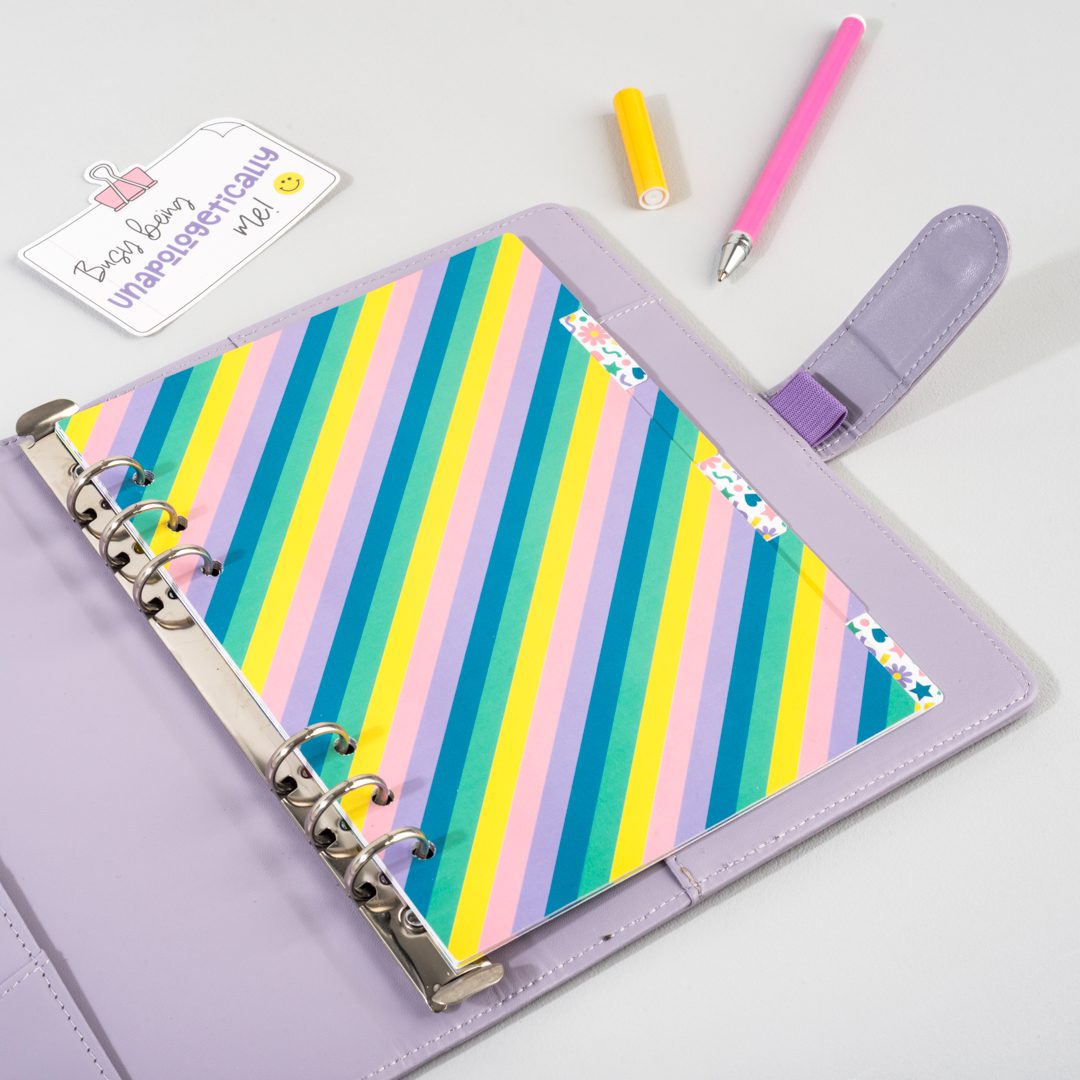 Our planner dividers are an easy way to organise your Hybrid Planner, whilst also adding some cute design details! Each set contains 6 double-sided tabbed dividers, with matching striped and confetti designs on alternate dividers.