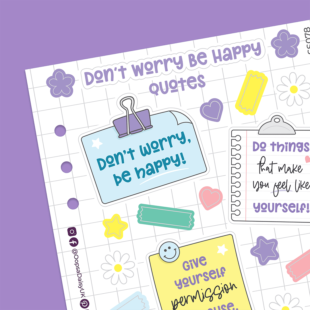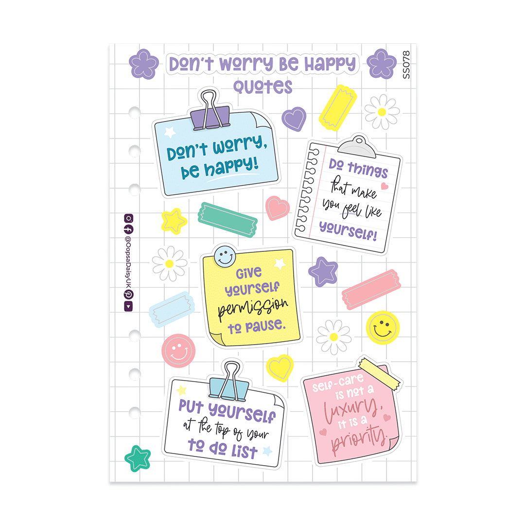 This sticker sheet features 23 super cute decorative stickers, including noticeboard style self-care quotes, Washi scraps, hearts, stars, happy faces and daisies.