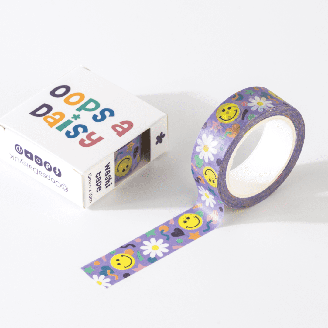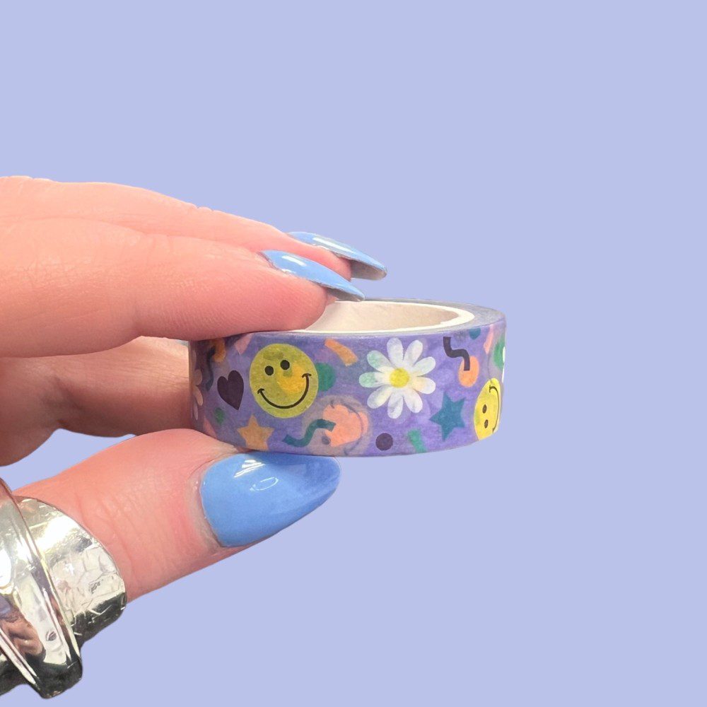 Brighten your journal or planner with this cheerful Washi Tape. Featuring playful smiley faces, white daisies, and colourful confetti details on a purple background, this design adds an instant pop of happiness to any spread.