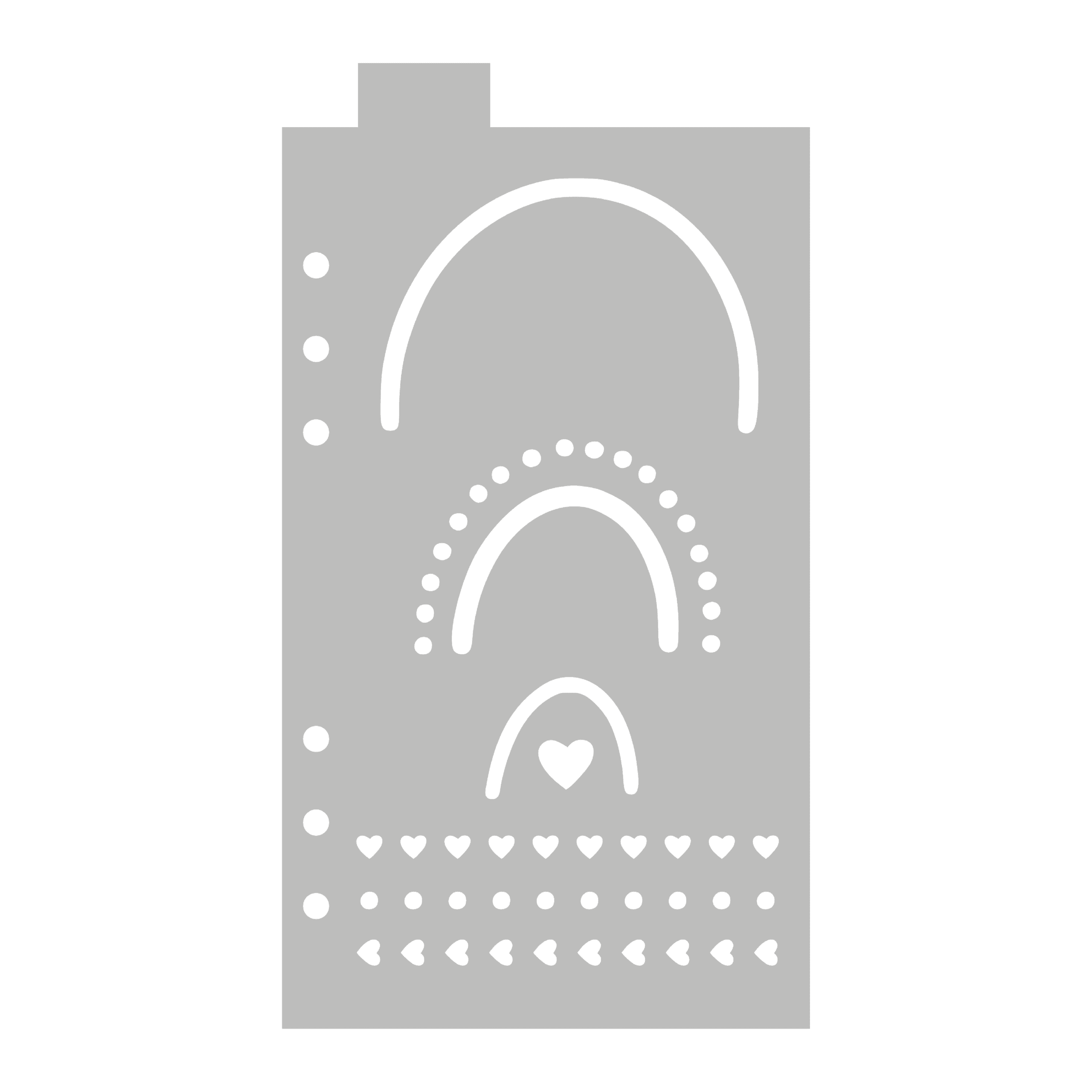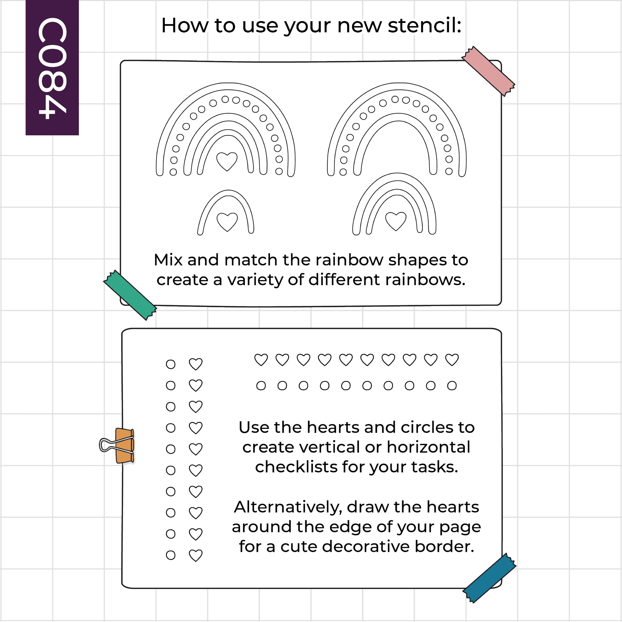 This stencil features the elements to help you draw a cute rainbow in a hand-drawn style, plus rows of hearts and circles to create matching to-do lists or decorative borders.
