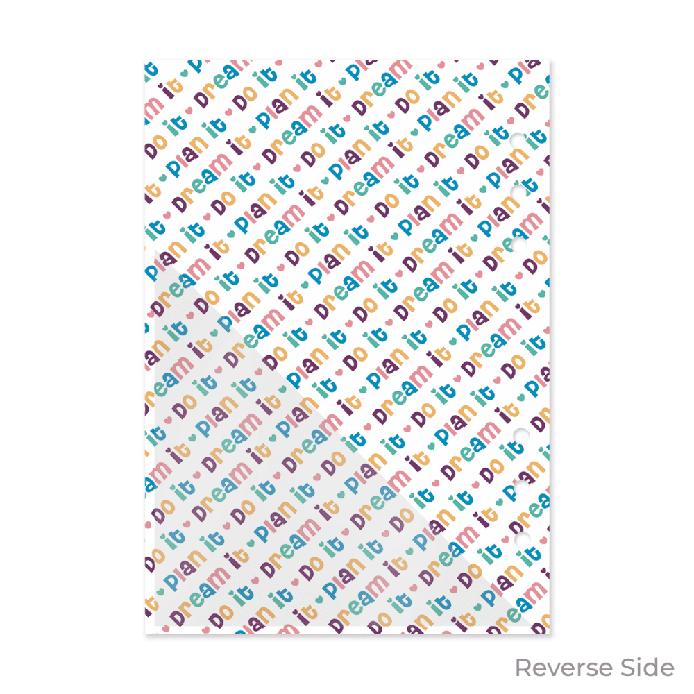 Our “Dream it. Plan it. Do it” dashboard features the Oops a Daisy brand font “Cheri” with stripes in our signature rainbow colours. On the reverse there’s a ‘Dream it. Plan it. Do it.” text pattern and a handy corner pocket for storing your important notes!