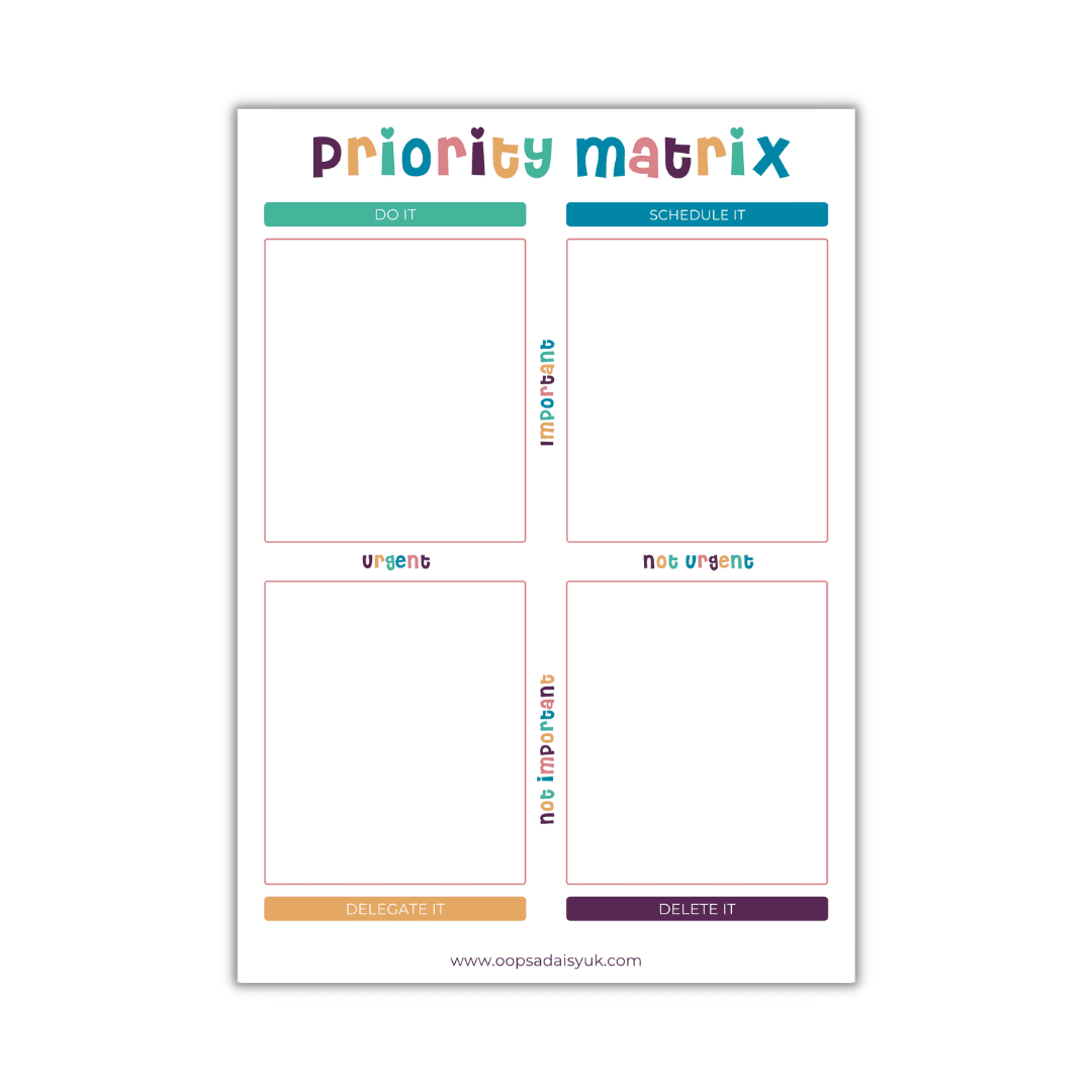 Our Priority Matrix journal worksheet is downloadable as a high quality PDF for you to print at home. Designed to help you plan and prioritise your to-do list by sorting your tasks into the four different sections.