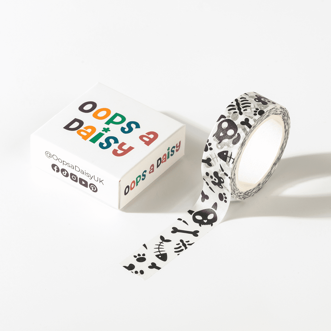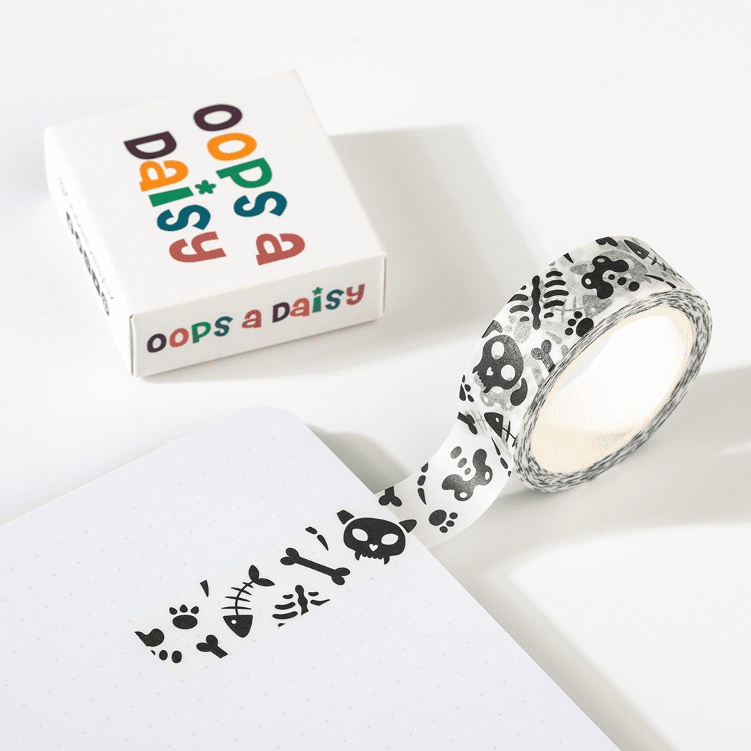 Add a spooky-cute touch to your journal or planner with this Fangs & Bones Washi Tape, featuring playful cat and dog skeleton illustrations alongside tiny bones, skulls, and fang details. The bold black-on-white design makes it perfect for gothic, Halloween, or alternative-themed spreads without feeling too dark.